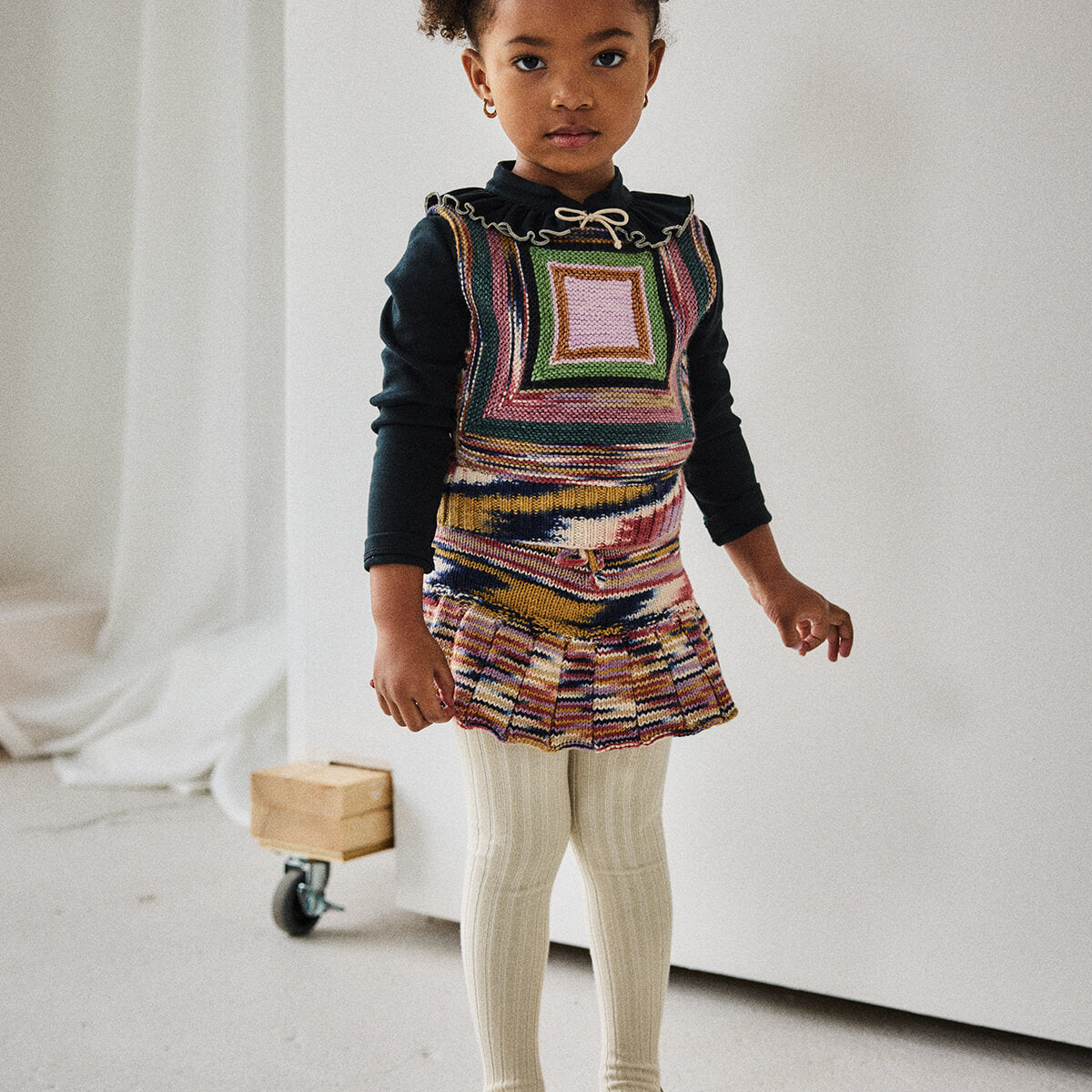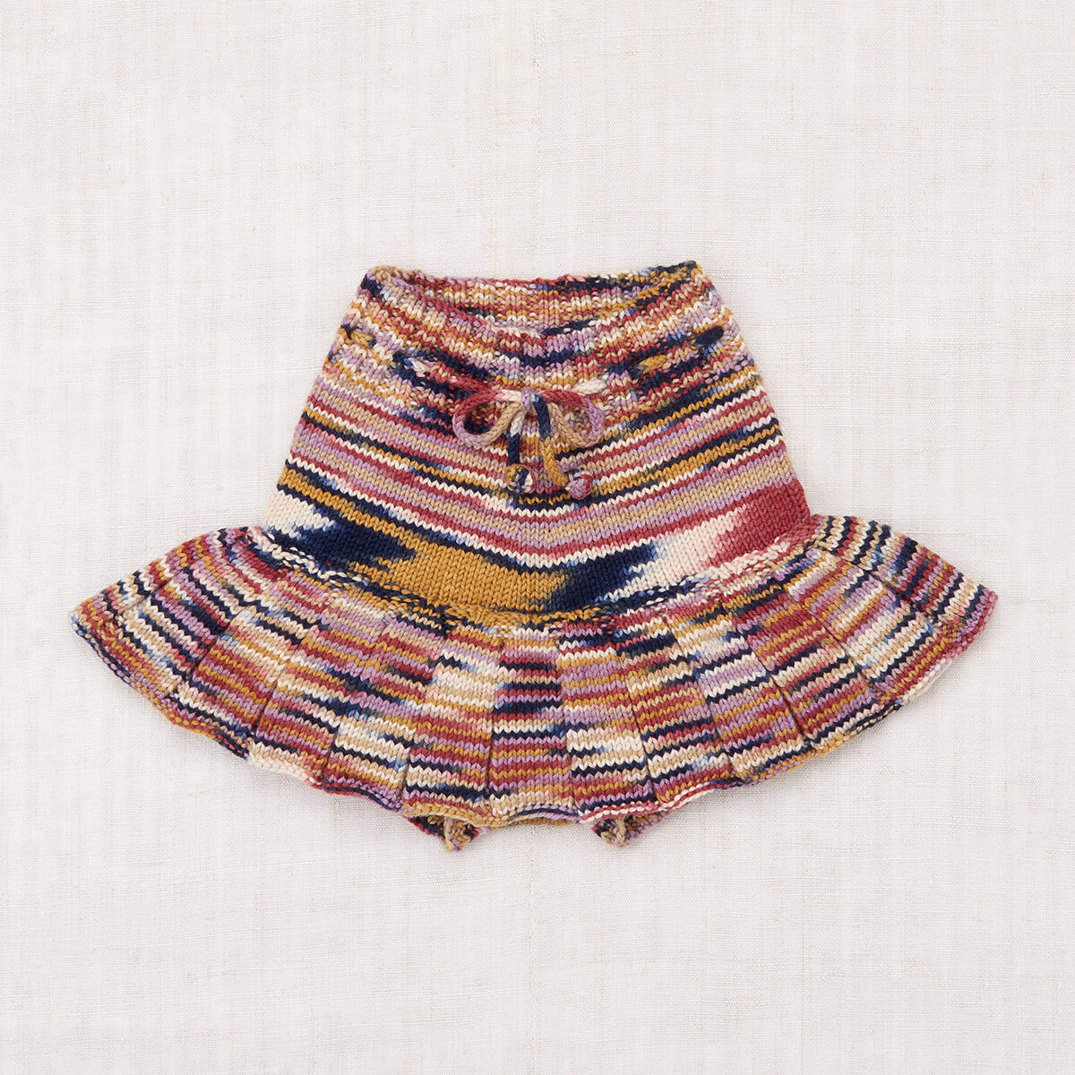 Skating Pond Skirt by Misha & Puff. A hand-knit skirt in heavier-weight Merino wool. Featuring attached bloomers with ribbed cuffs and a ribbed waistband with a popcorn tie drawstring for a secure fit.