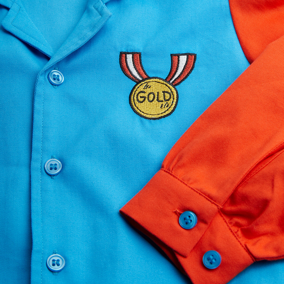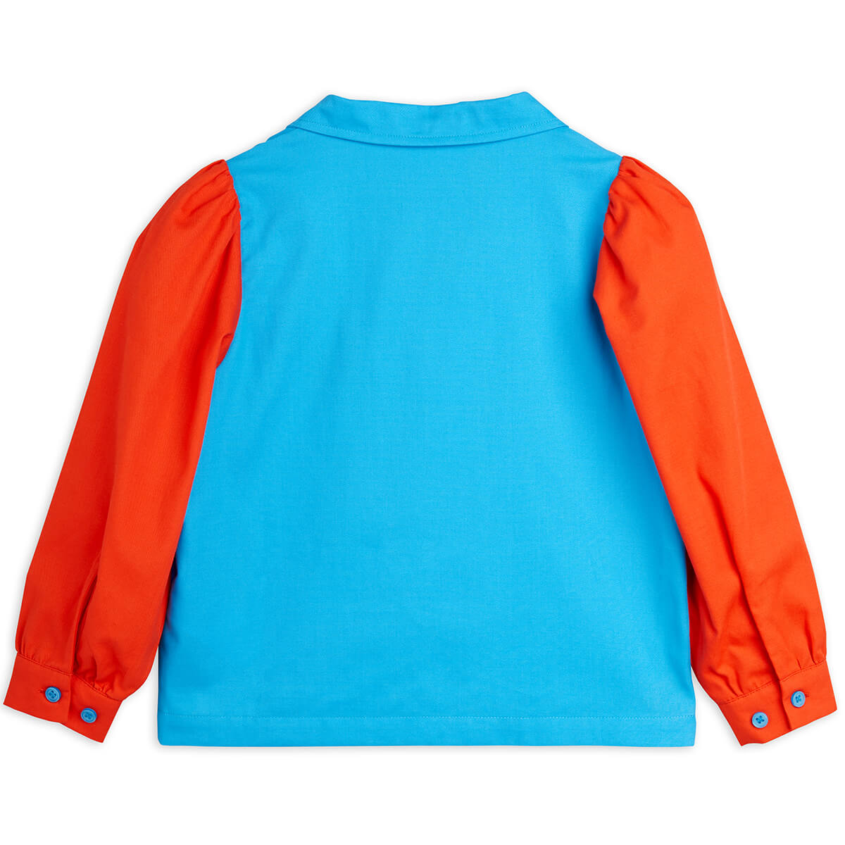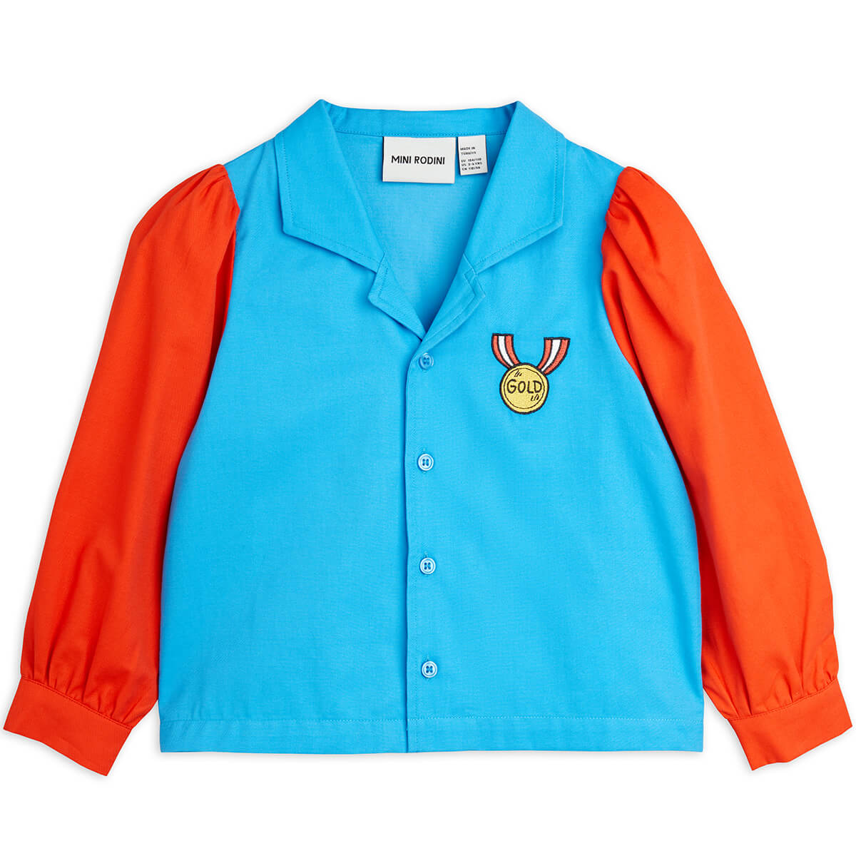 Medal embroidered woven blouse by Mini Rodini. Embroidered blouse with cuban collar. Features an embroidered medal on the chest and contrast coloured puff sleeves.