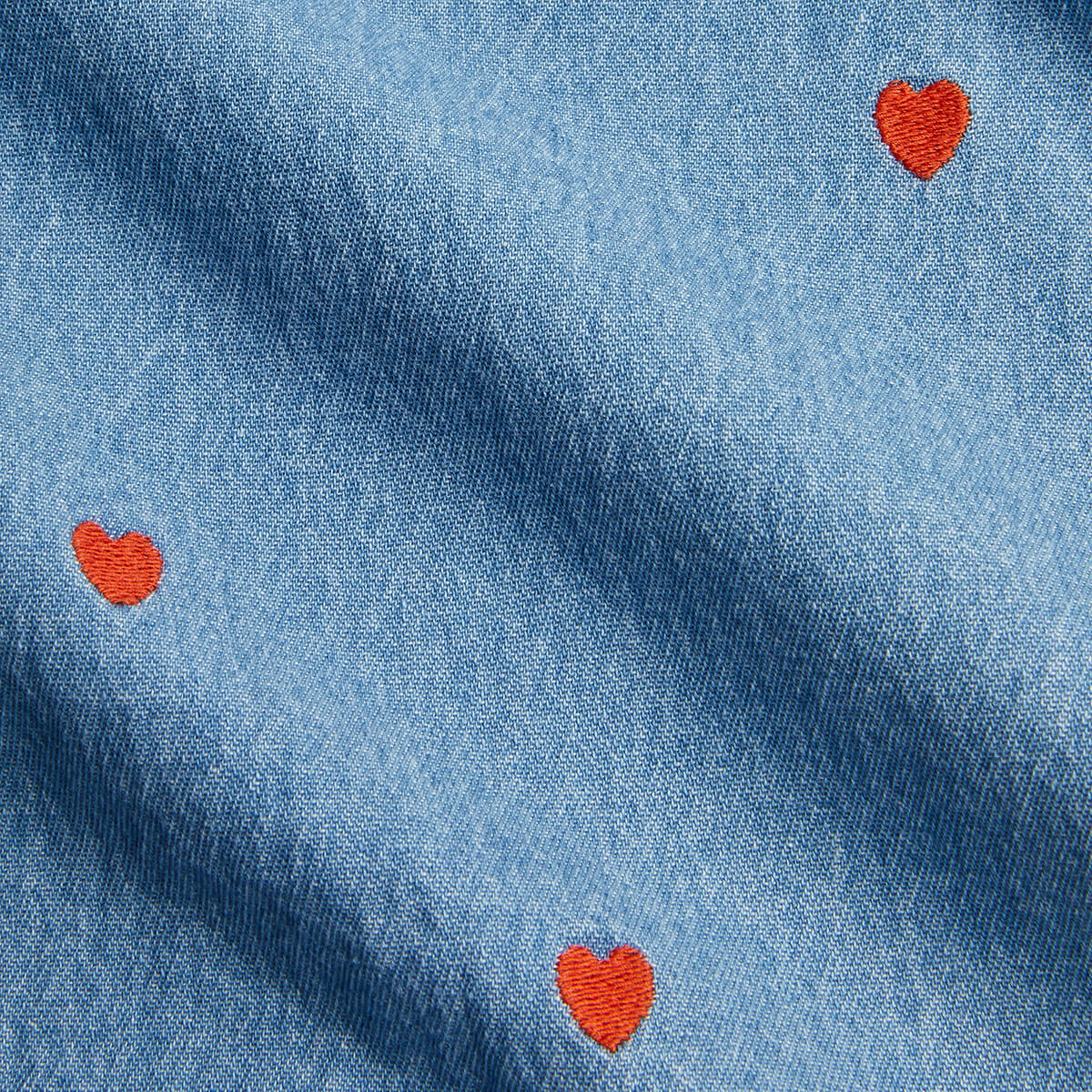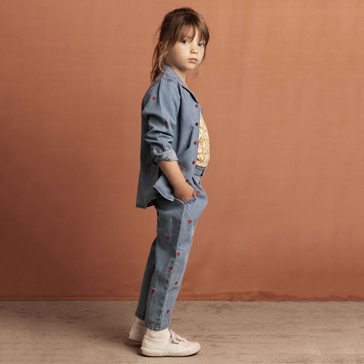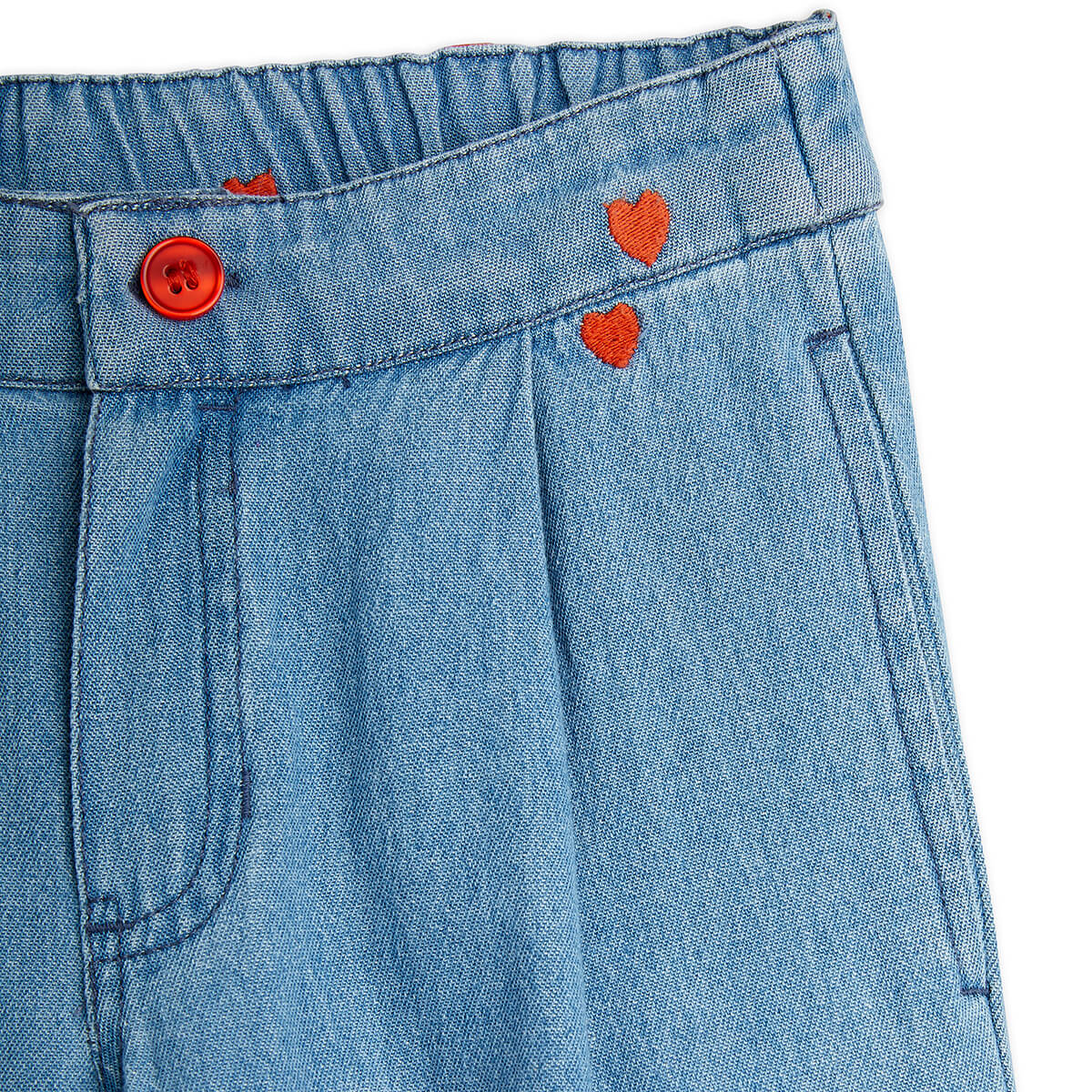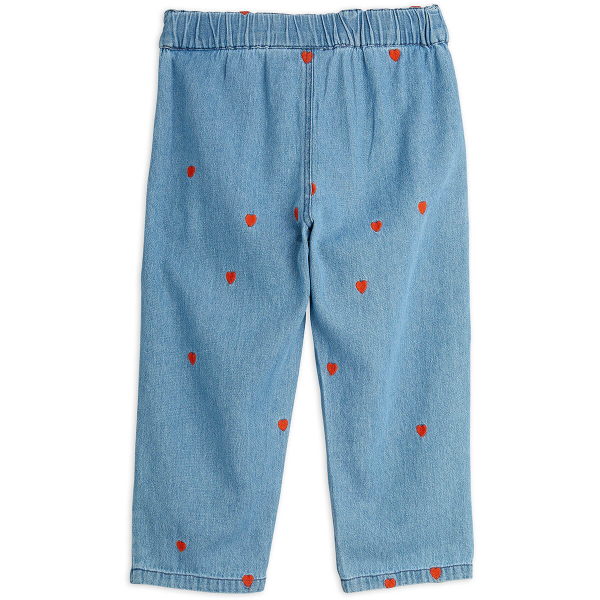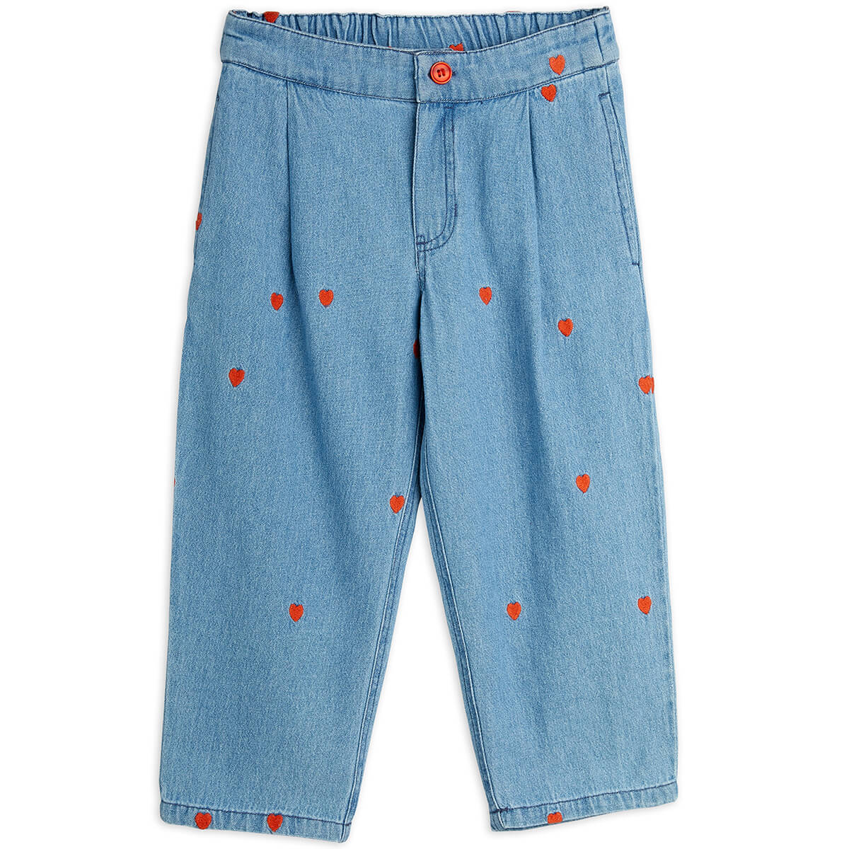 Mini Hearts AOP Woven Trousers by Mini Rodini. Relaxed tapered-fit jeans in 100% GOTS-certified organic cotton, with embroidered red mini hearts, side pockets, and an elastic waist with red button. No zipper – for easy dressing.
