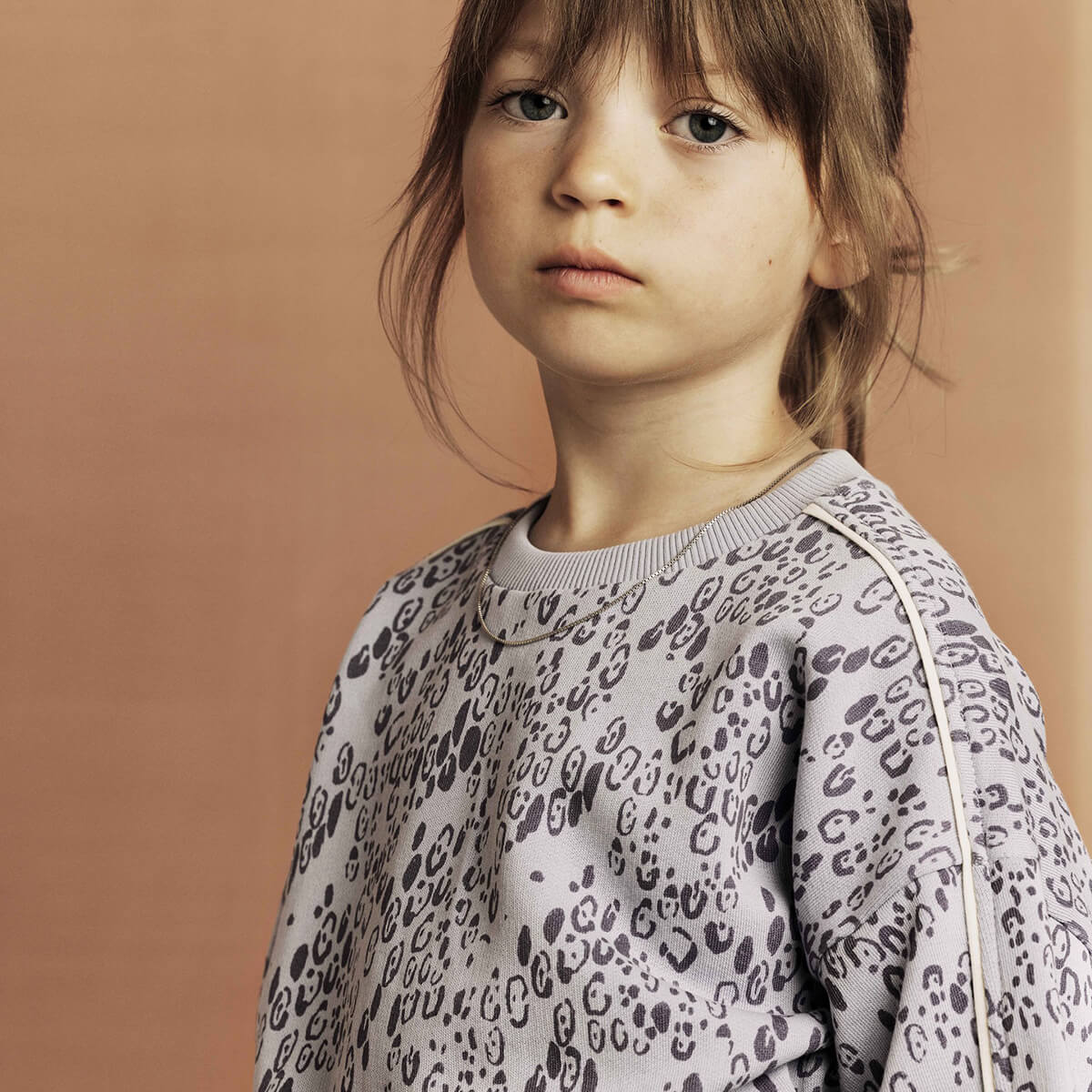 Mini Leopard Sweatshirt by Mini Rodini. Sweatshirt in an all over leopard print, made from 100 % GOTS certified organic cotton. Designed for a relaxed fit with dropped shoulders, finished with a ribbed collar, elastic trims and contrasting piping.