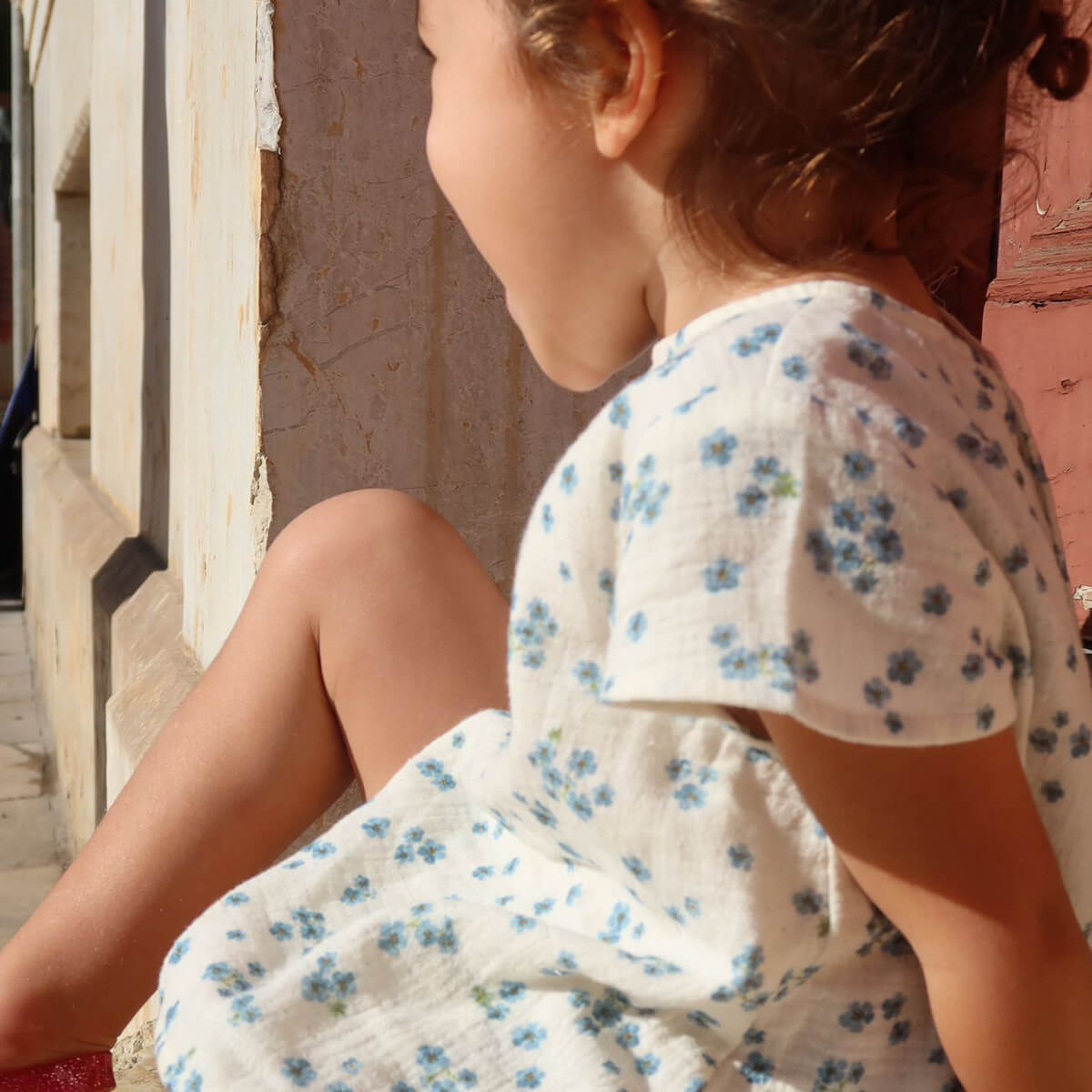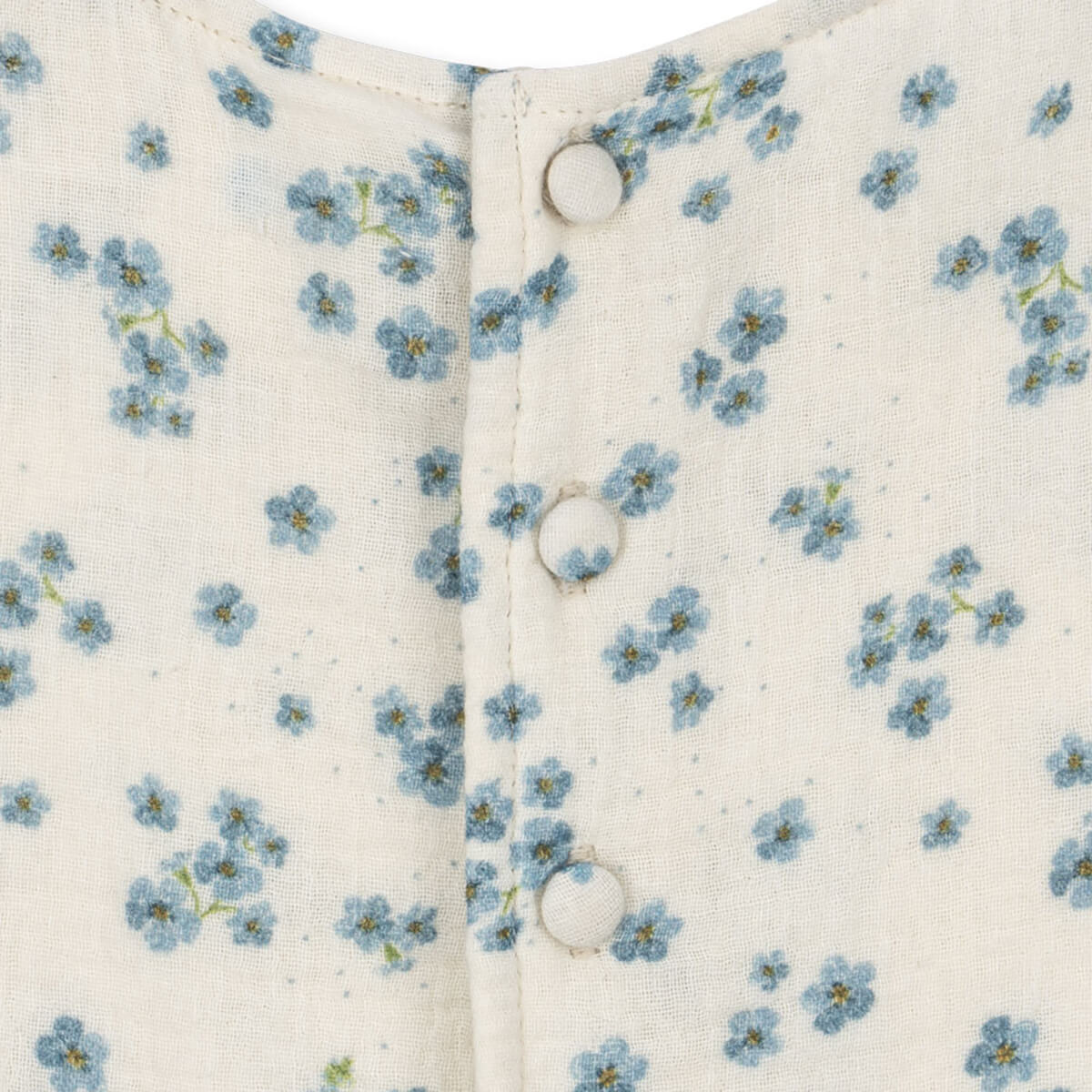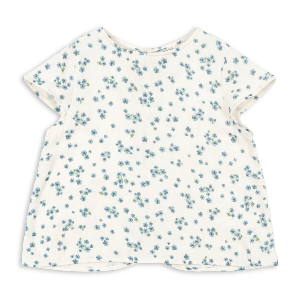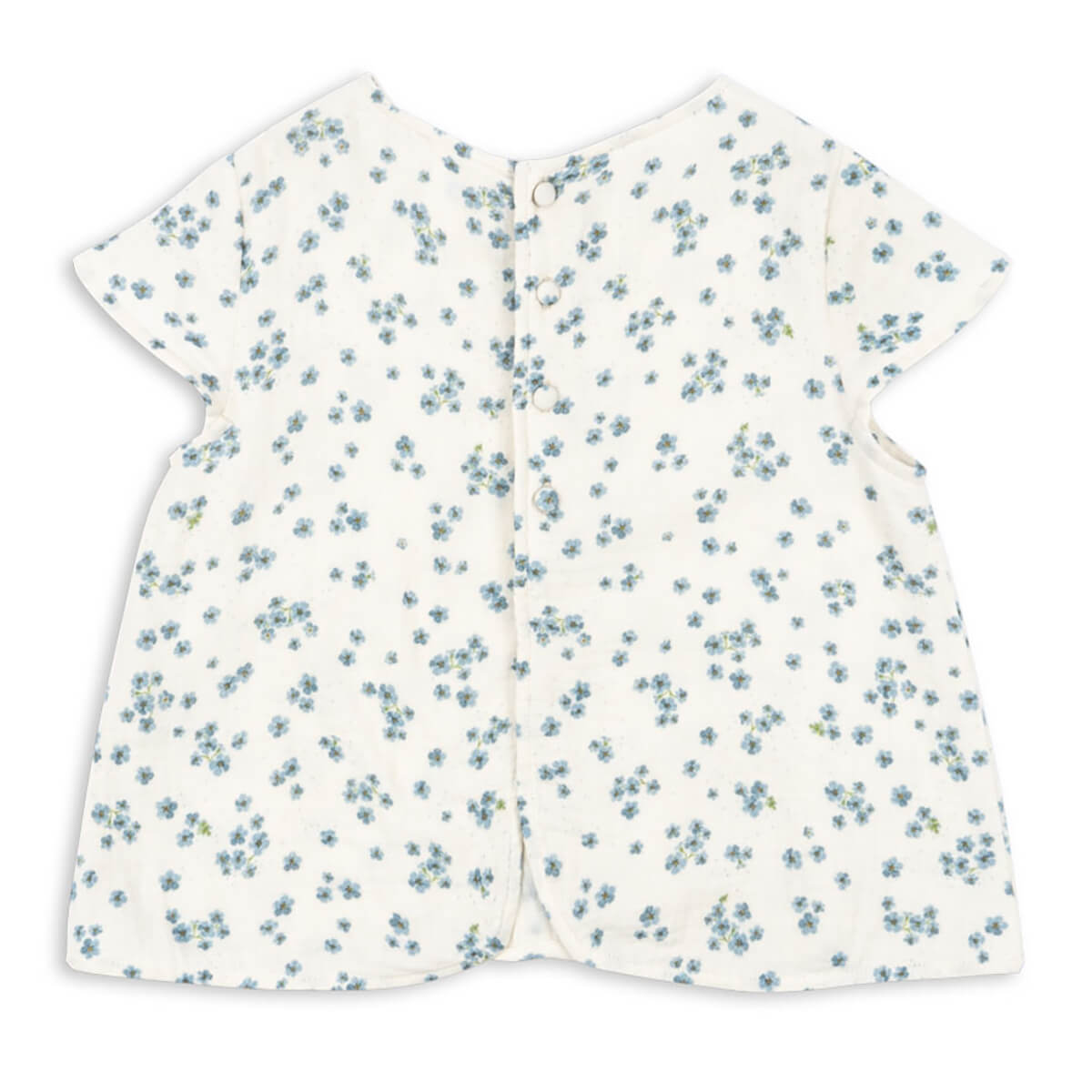 Mioblu Top by Rosie Huntington-Whiteley x Konges Sløjd. Soft short-sleeved blouse crafted in a light organic cotton muslin with a sweet forget-me-not flower print, hand-drawn as a nostalgic nod to Rosie's favourite childhood flower.