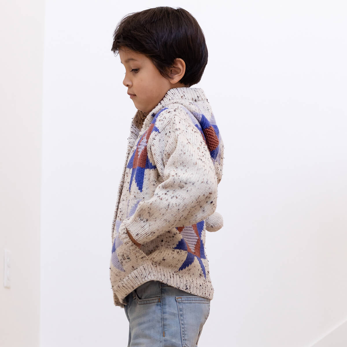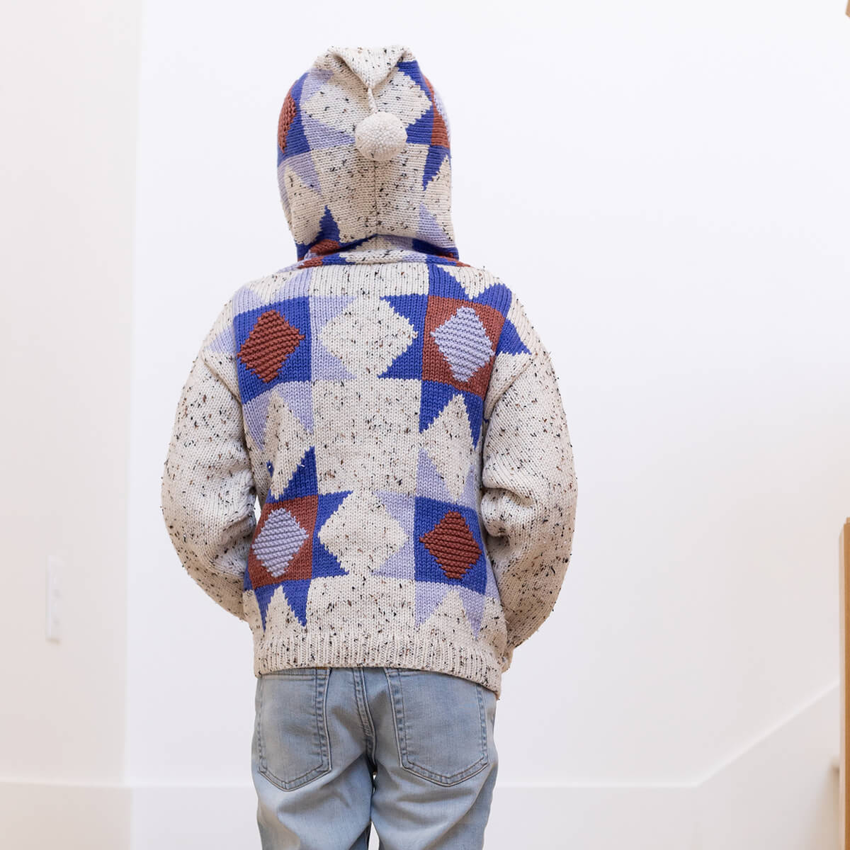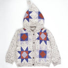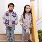 Patchwork Hooded Jacket by Iver & Isla. a stunning remake of Iver & Isla's popular first-edition patchwork quilt jacket, with horn buttons and pom detail.