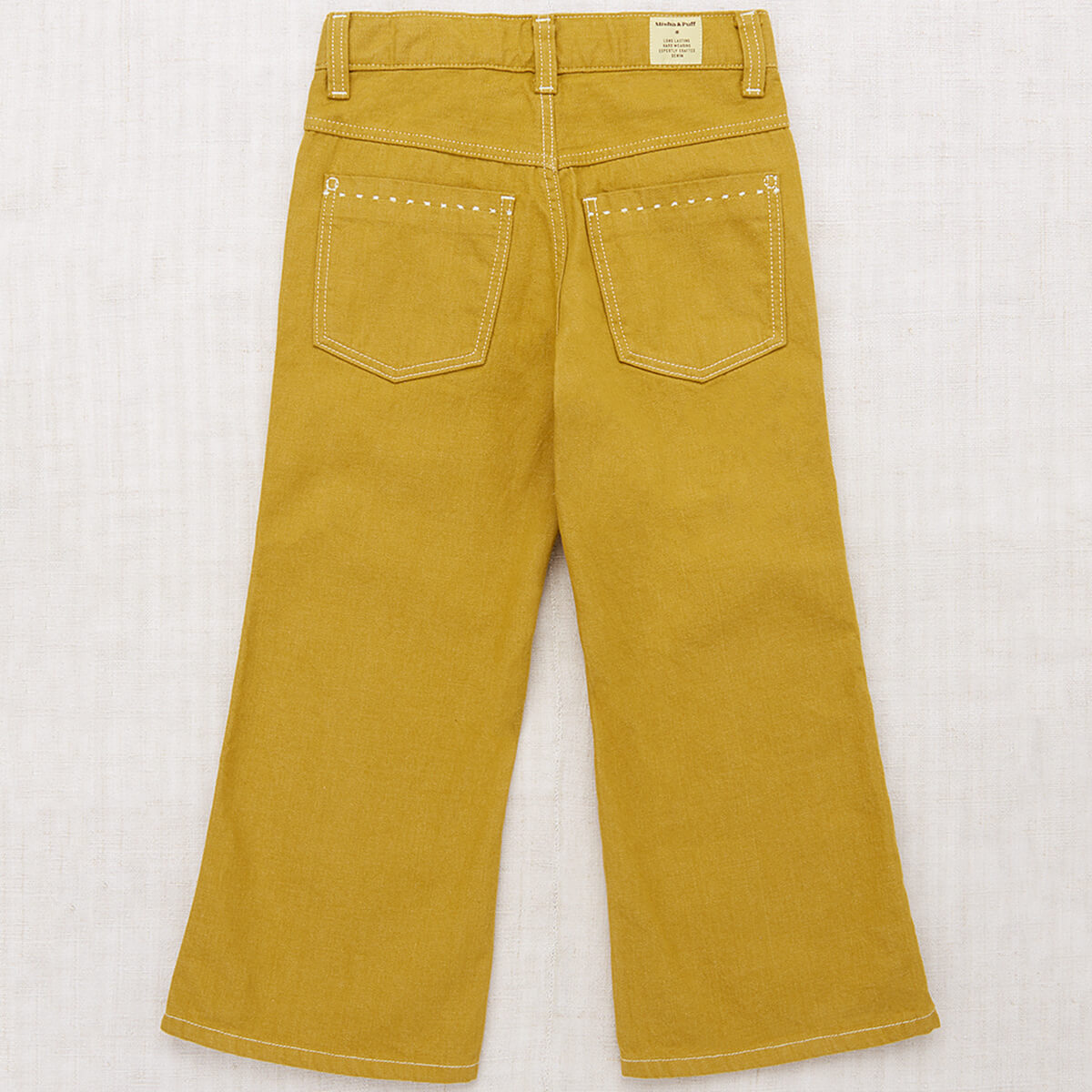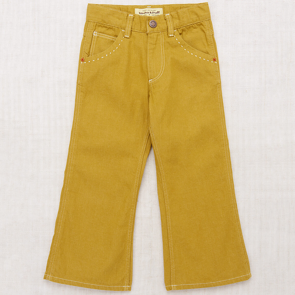 Slim Flared Jeans by Misha & Puff. From Misha & Puff's brand new Denim Collection — an incredibly versatile, vintage-inspired slim flared-leg jean in 100% cotton denim, with five pockets, contrast print lined pockets, contrast topstitch detail and interior adjustable waistband for the perfect fit. Finished with hand-tacked stitches instead of rivets for softness.