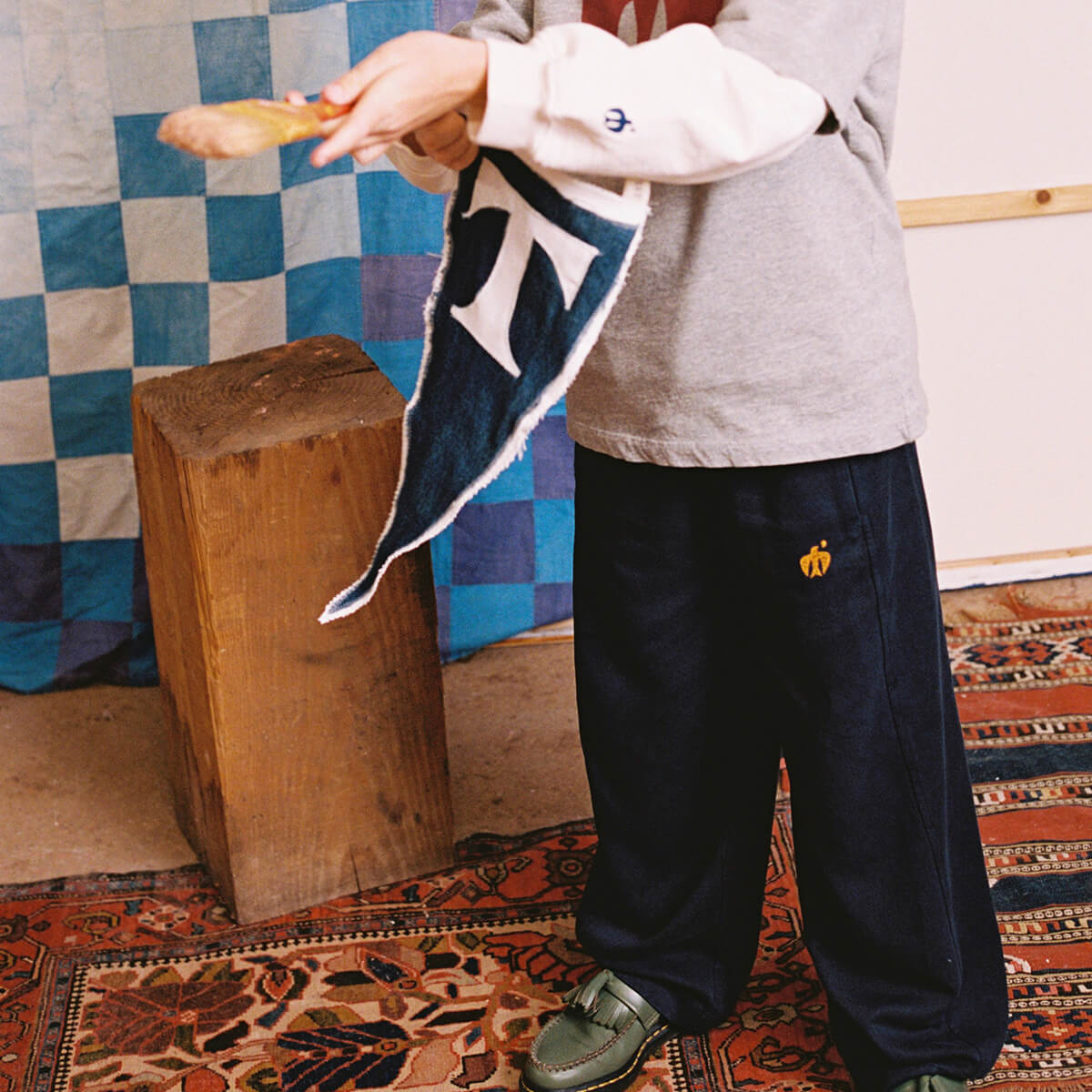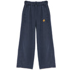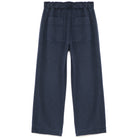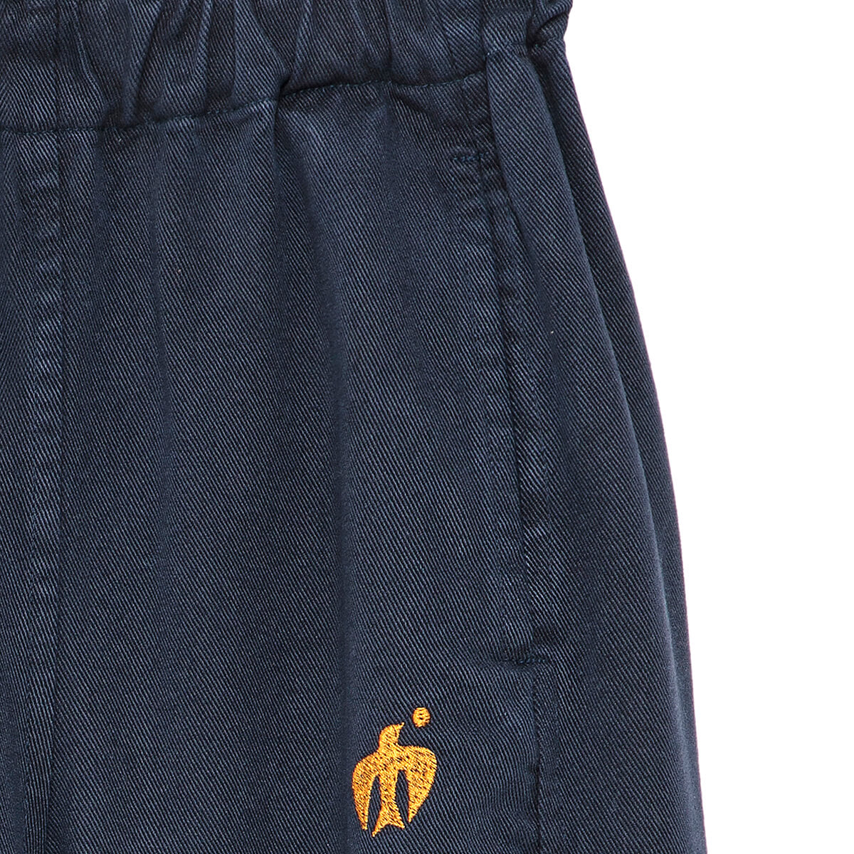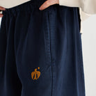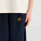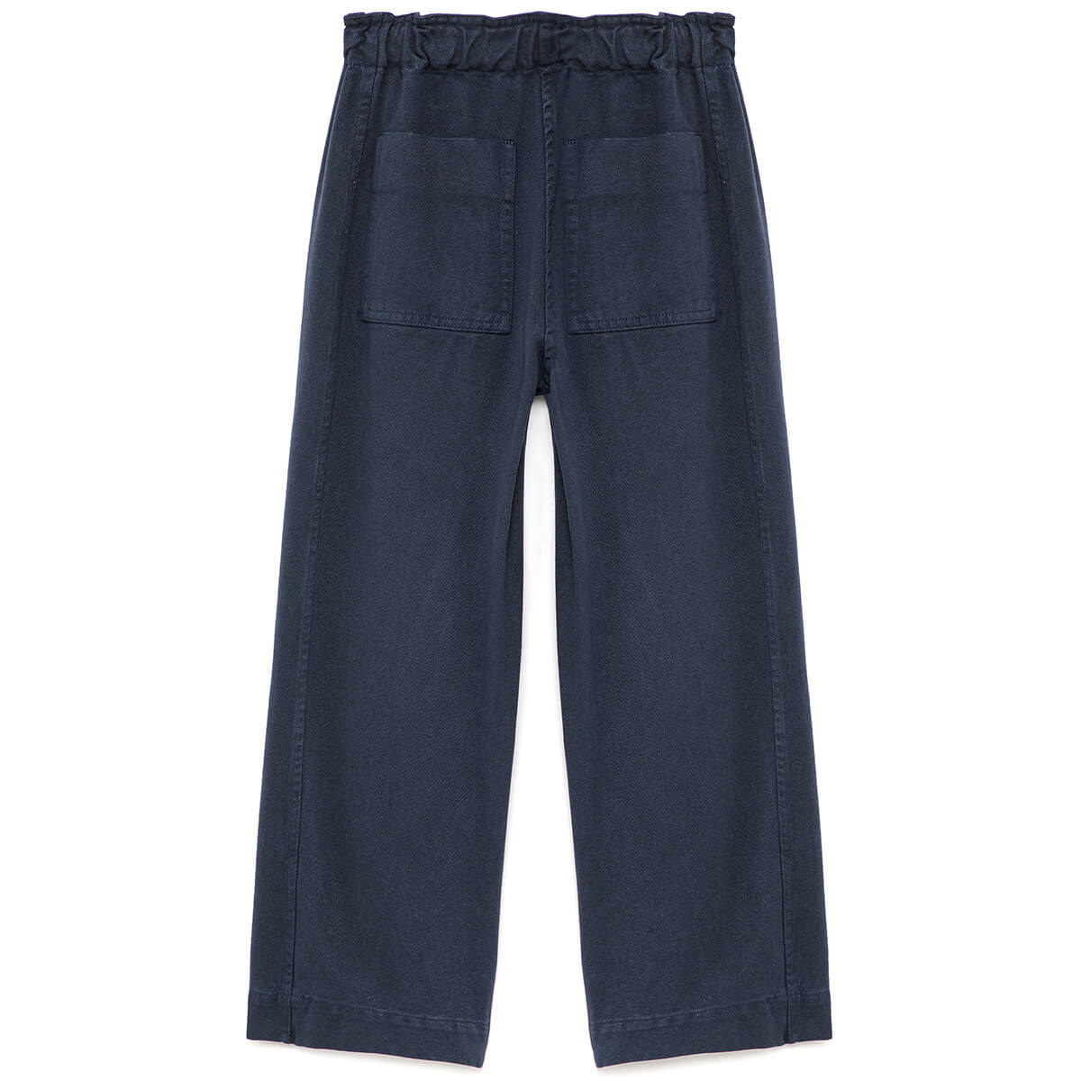 Trousers nº13 in Navy Blue by True Artist. These relaxed fit cotton trousers feature front leg panelled details, two side seam pockets, two patch back pockets and a gathered elasticated waist.