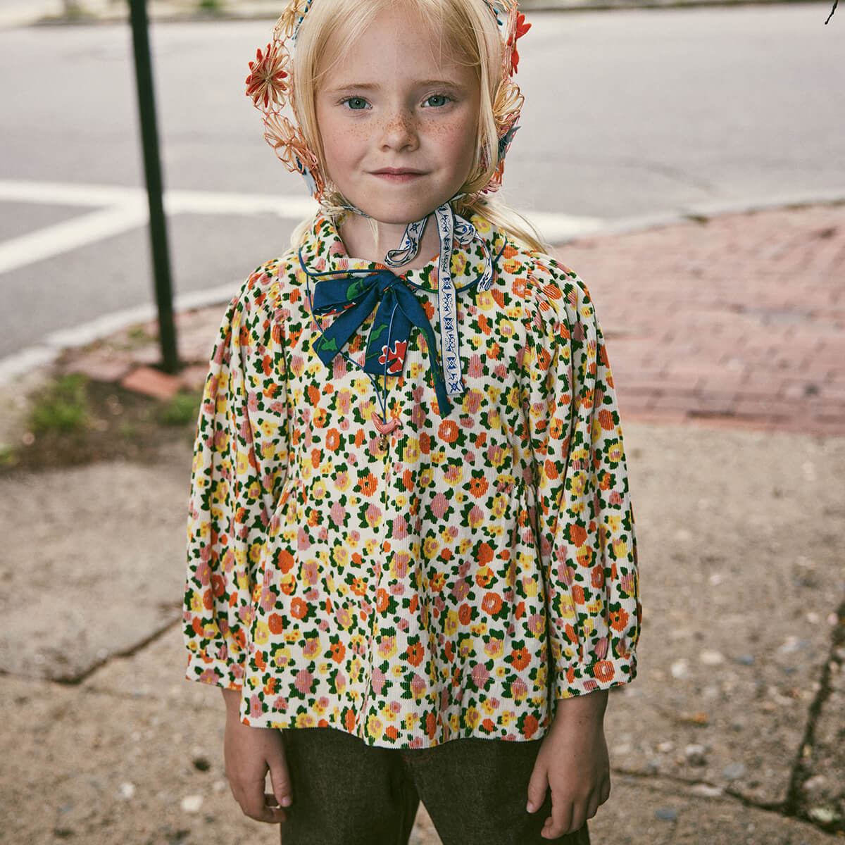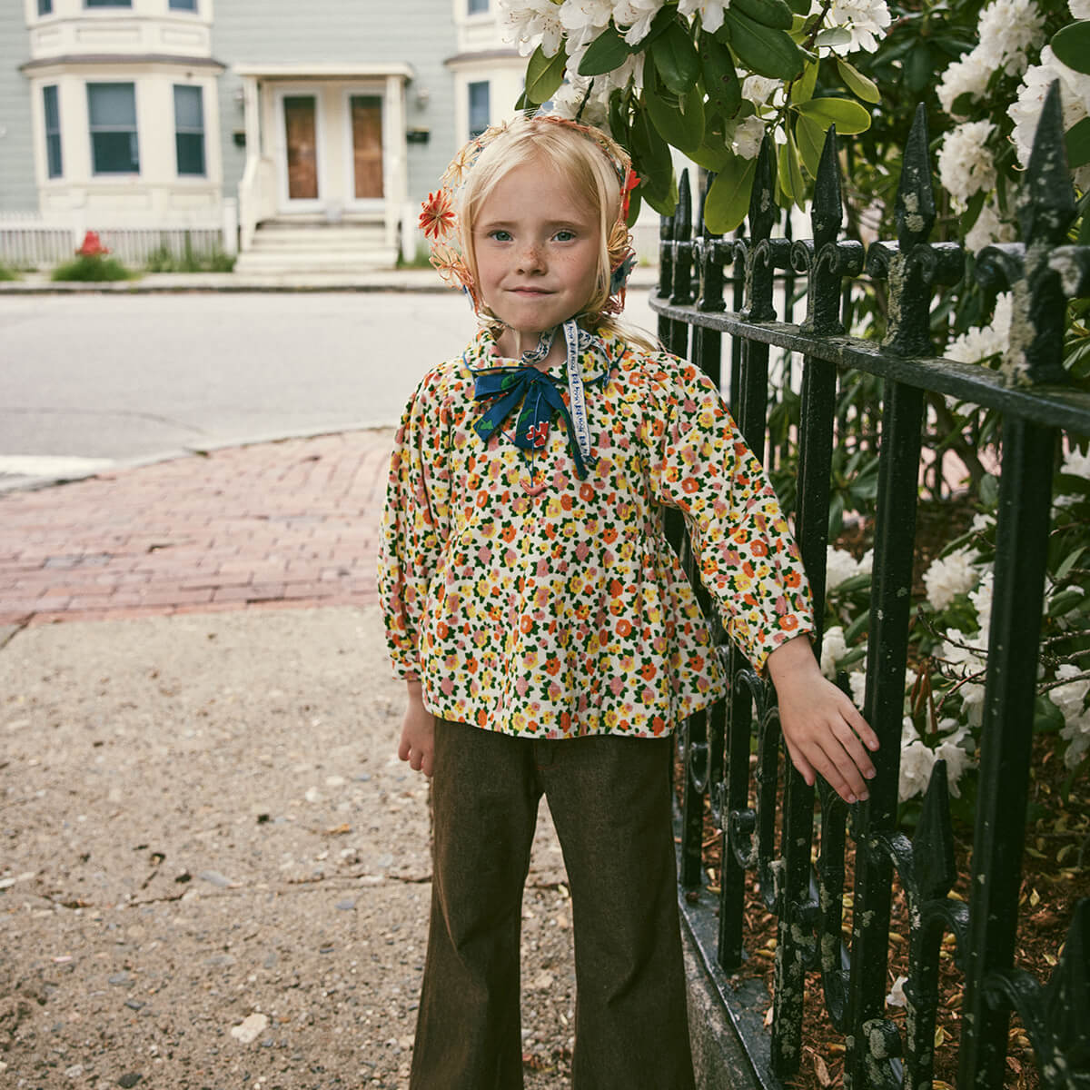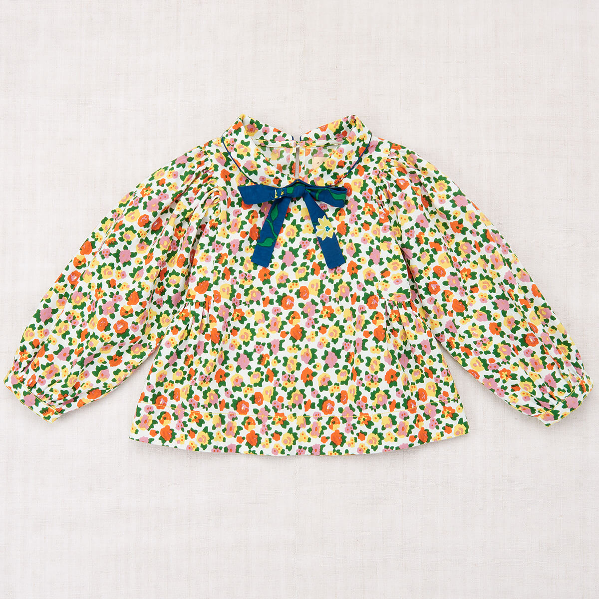 Zora Blouse by Misha & Puff. A peplum-style long-sleeved top in cotton twill, featuring blouson sleeves, a rounded collar with contrast trim, and a contrast-print bow at the center front. Finished with French seams.
