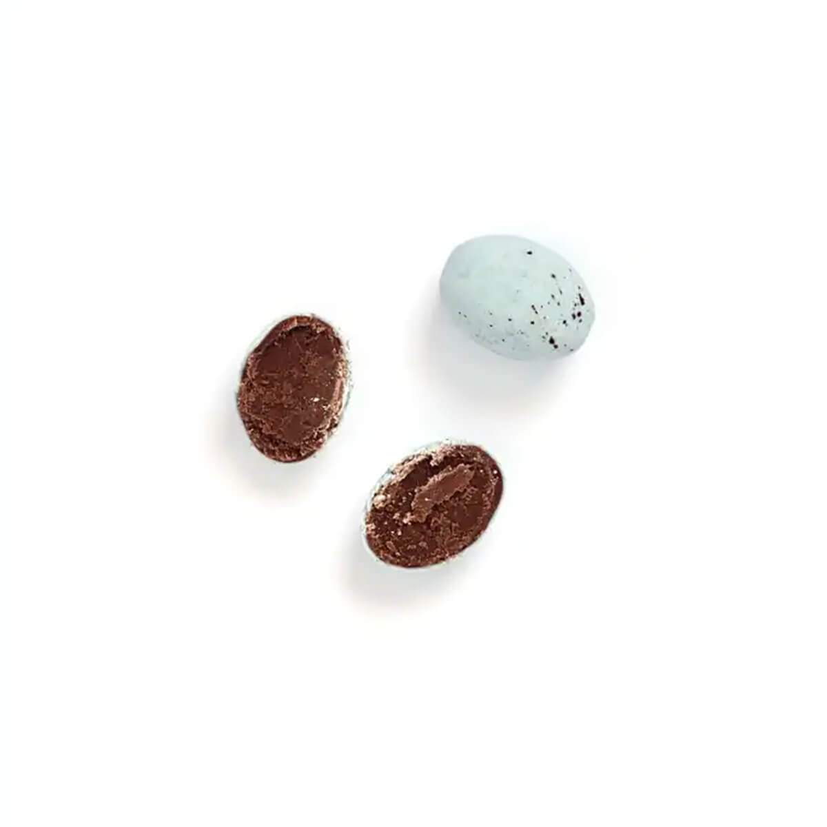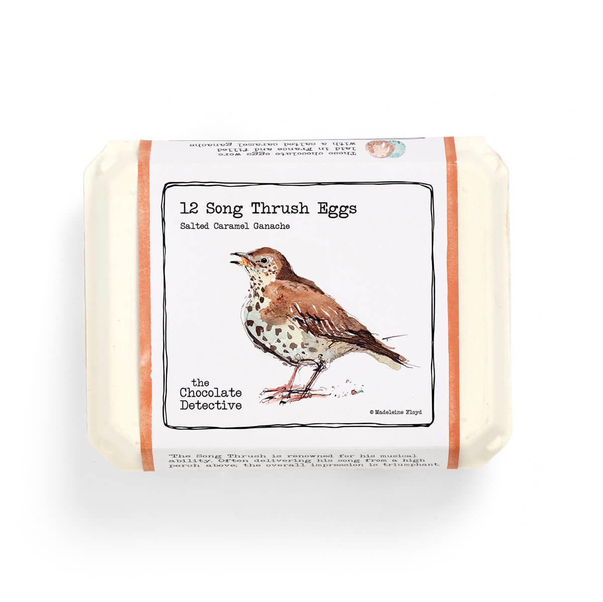 12 Song Thrush Eggs by The Chocolate Detective. 12 Chocolate Eggs filled with Salted Caramel. Layers of dark and milk chocolate are filled with a buttery ganache and gently salted caramel before being wrapped in a fine sugar shell and life-like speckles. Please note that the Song Thrush eggs are currently in brown summer plumage, with the same delicious caramel recipe.