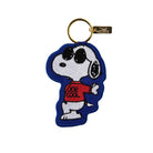 Joe Cool Snoopy Keyring by by Magpie. Embroidered patch style key charm. Double sided embroidered fabric retro patch designs. Comes with golden keyring and golden embossed magpie logo tag. With coloured backing card gift packaging.