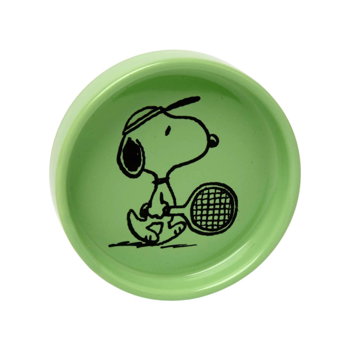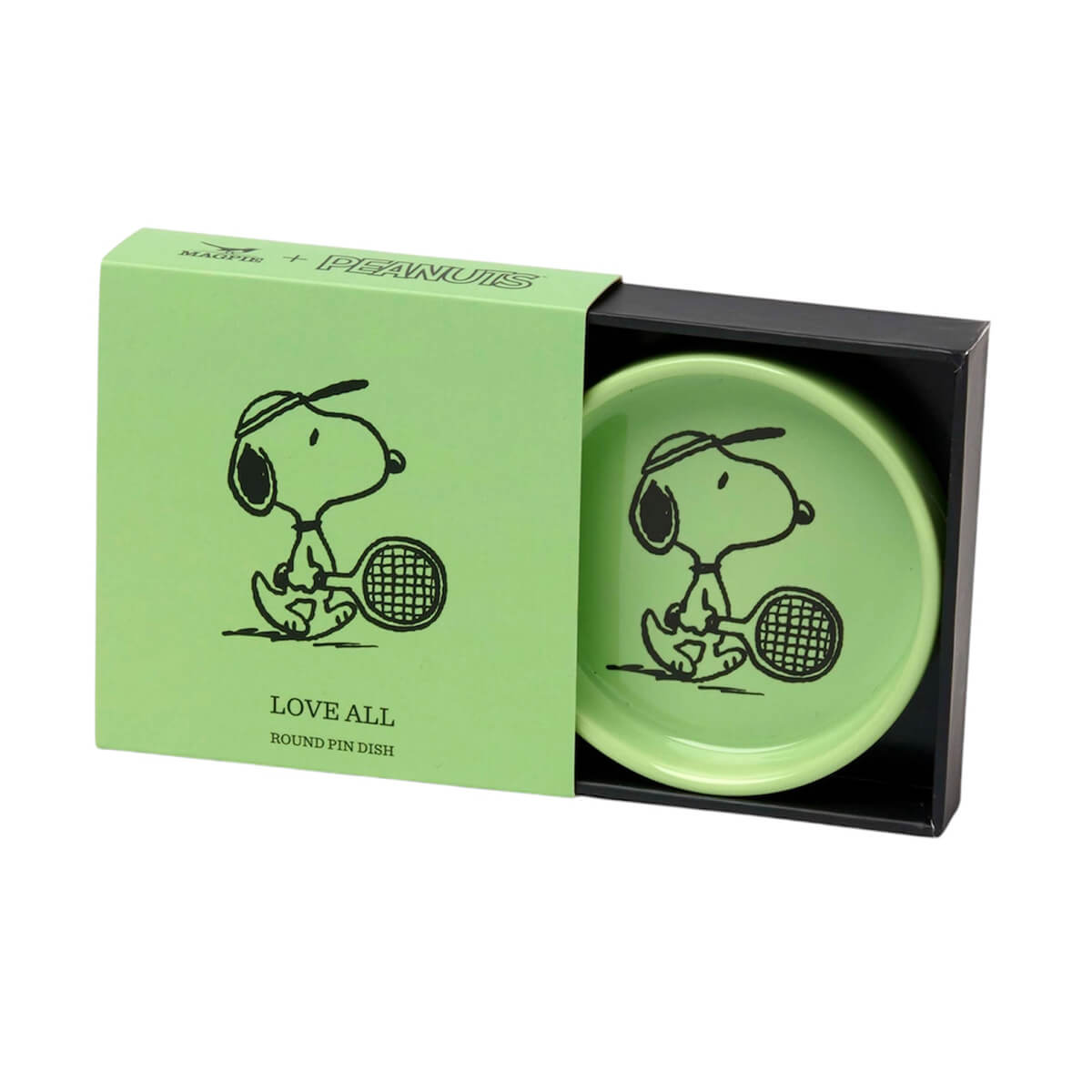 Love All Snoopy Pin Dish by Magpie. Cute 8cm round shaped coloured glaze vegan ceramic shaped dish/tray. Decorated with a black decal of Snoopy ready for tennis. With slide out colourful gift box.