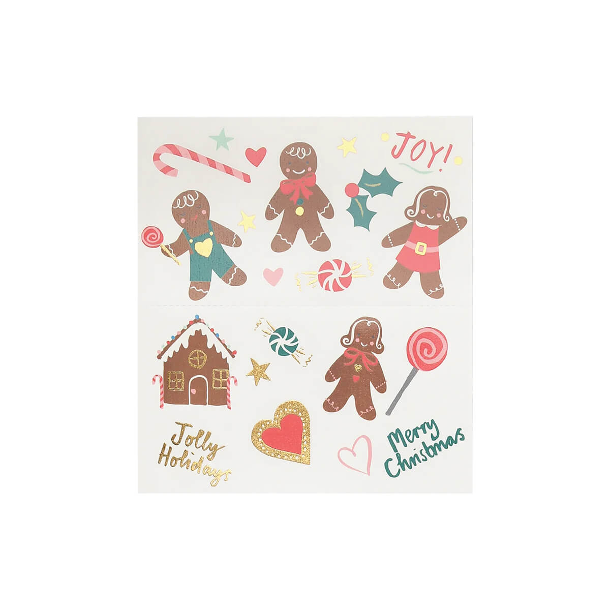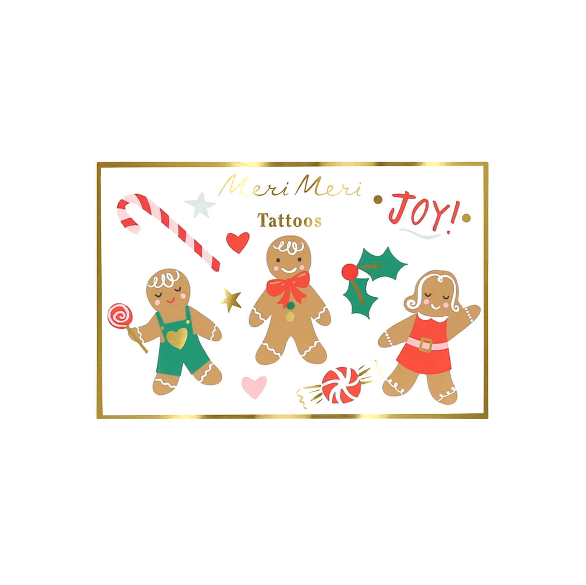 Gingerbread Tattoos by Meri Meri. Temporary tattoos are the perfect Christmas accessory and are ideal as stocking fillers, party favours and to pop into party bags too. They're also an excellent Christmas party activity that kids will love. This pack features on-trend gingerbread people and houses, candy canes and happy festive messages.
