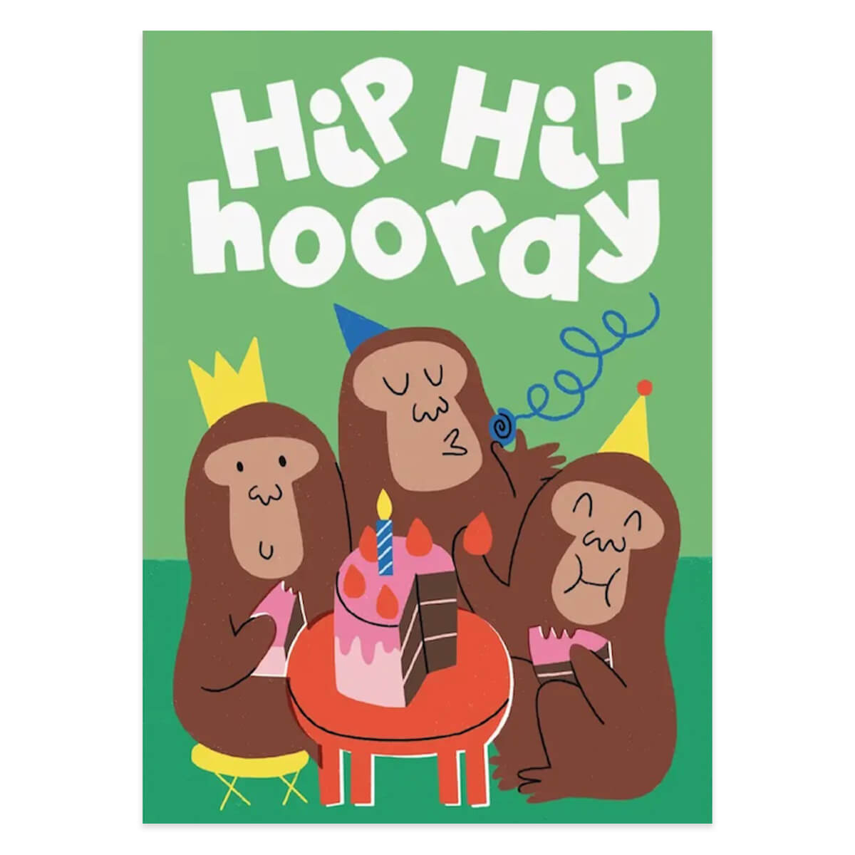 Hip Hip Hooray Birthday greetings card by Studio Boketto. A trio of excited monkeys donning party hats gather around a pink chocolate cake on this birthday card, complete with a single birthday candle and several slices already missing - the party's already started! This monkey birthday card has a bold green background and a "Hip Hip Hooray" caption in a huge bold font, making it perfect as a kids birthday card for all animal-loving children. The inside is blank, ready for a handwritten message.
