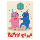 Party Time Birthday greetings card by Studio Boketto. It's Party Time! Two colourful kitties in party hats are tearing up the dance floor on this birthday card, celebrating beneath a glimmering disco ball. The bold illustration on the disco birthday card is perfect for those friends who are always down for a boogie - the inside of the cat card is blank, so you can write your own handwritten messages with more suggestions on how to party!