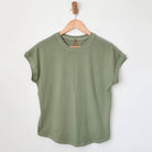 Ease Tee by Le Bon Shoppe. The Ease Tee is an edgy dolman tee. It features a high crew neck, shoulder coverage without a sleeve, slightly rounded hem and a contrast rib banded sleeve opening and neck opening. With a crisp colour palette and enough length to tuck in or out this is the perfect piece for a cool girl's uniform.