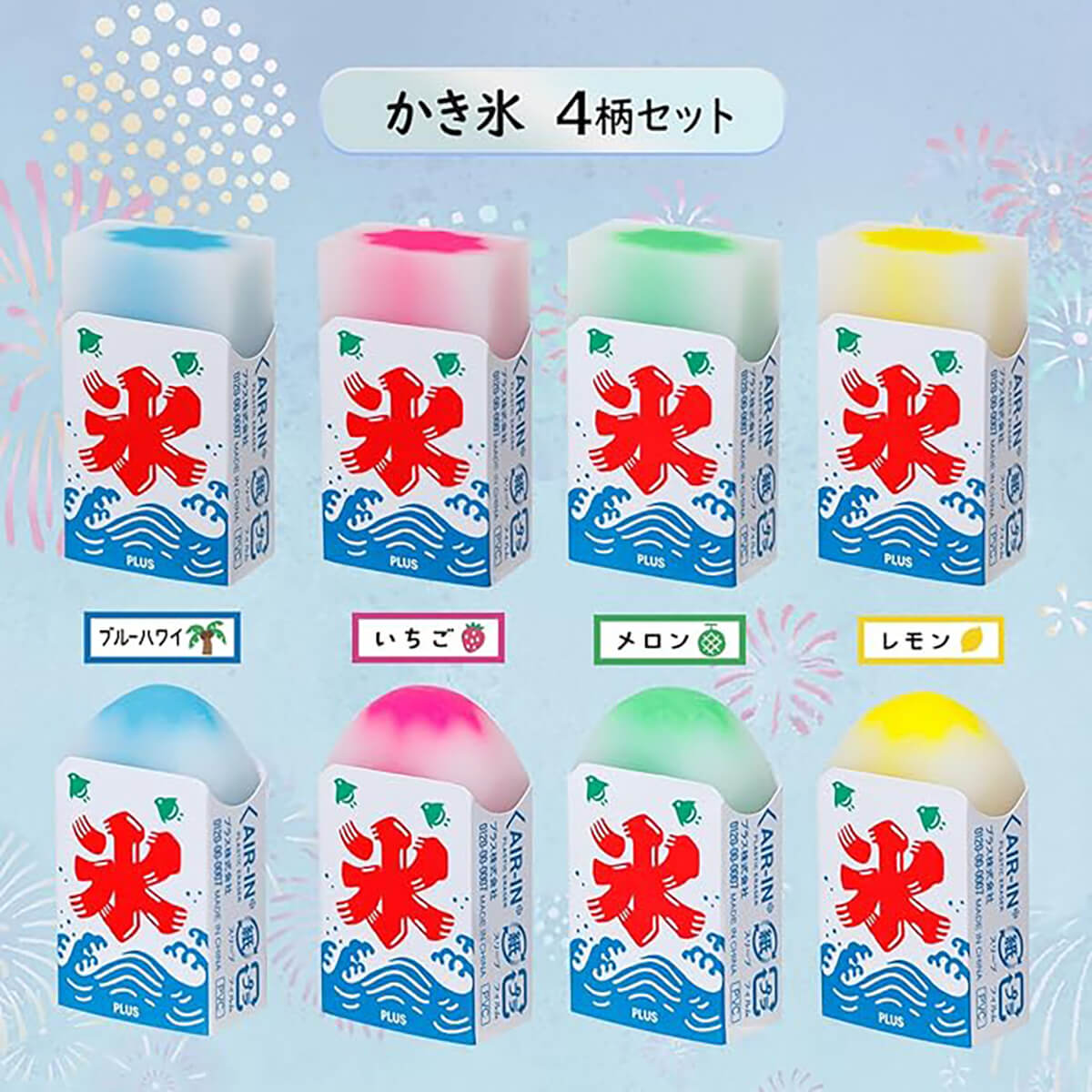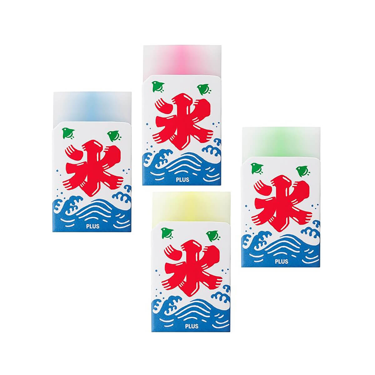 Air In Shaved Ice Summer Festival Eraser by Plus Japan. Erase evenly in all directions — left, right, front, and back you will have a rounded "shaved ice" eraser. Translucent resin ice with neon syrup in four 'flavours' blue Hawaii, strawberry, melon and lemon. With each use, the eraser changes shape and reveals a new expression, making the act of erasing itself a source of enjoyment. In a summer festival patterned case. Made from PVC.