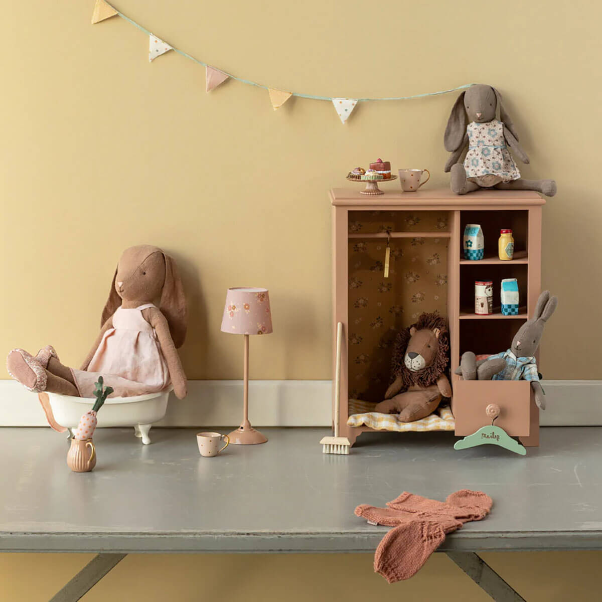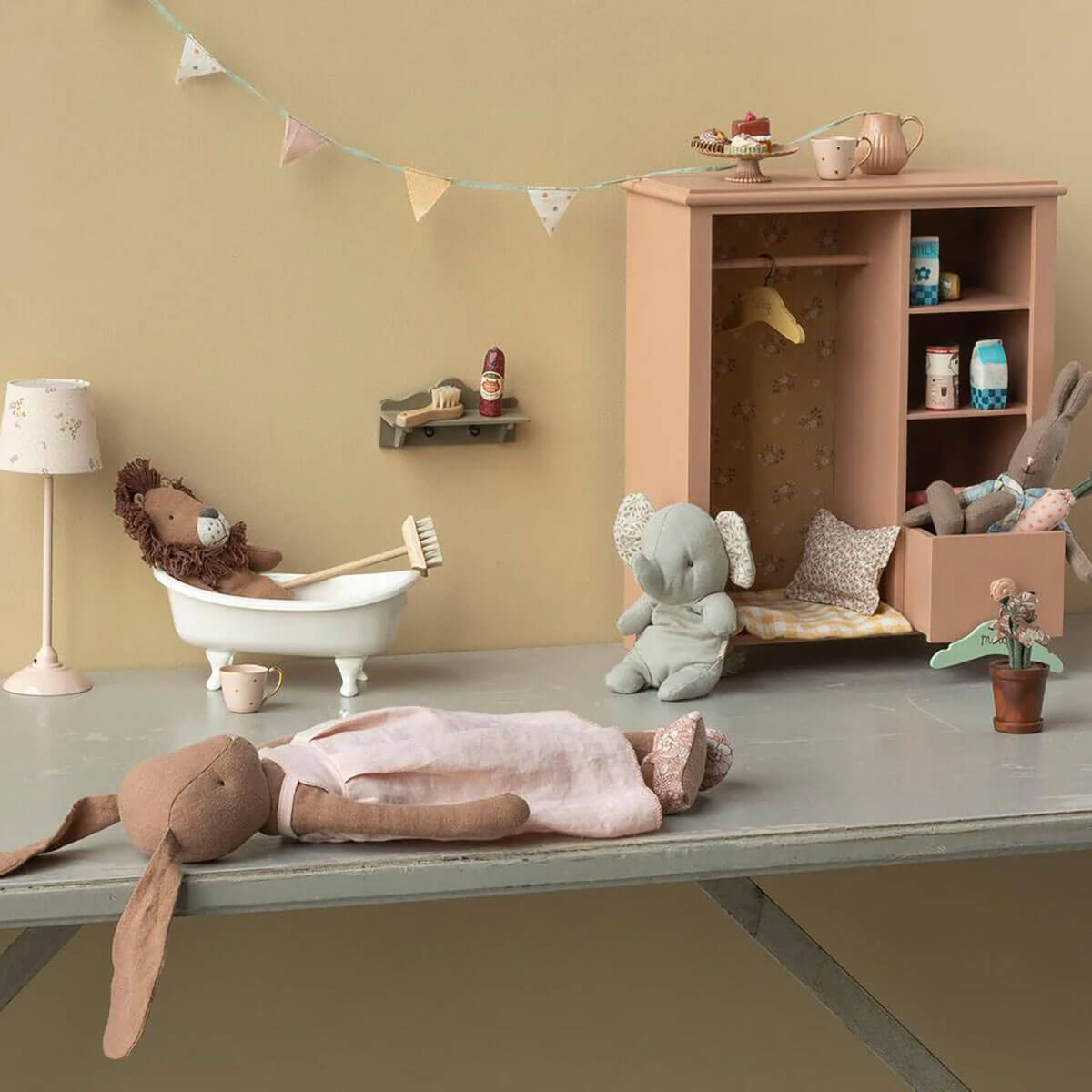 Bunny in dress in size 3 by Maileg. A classic bunny made of soft natural fabrics that gives a lovely hand feel and look. She is dressed up in a lovely dress and wear soft shoes.