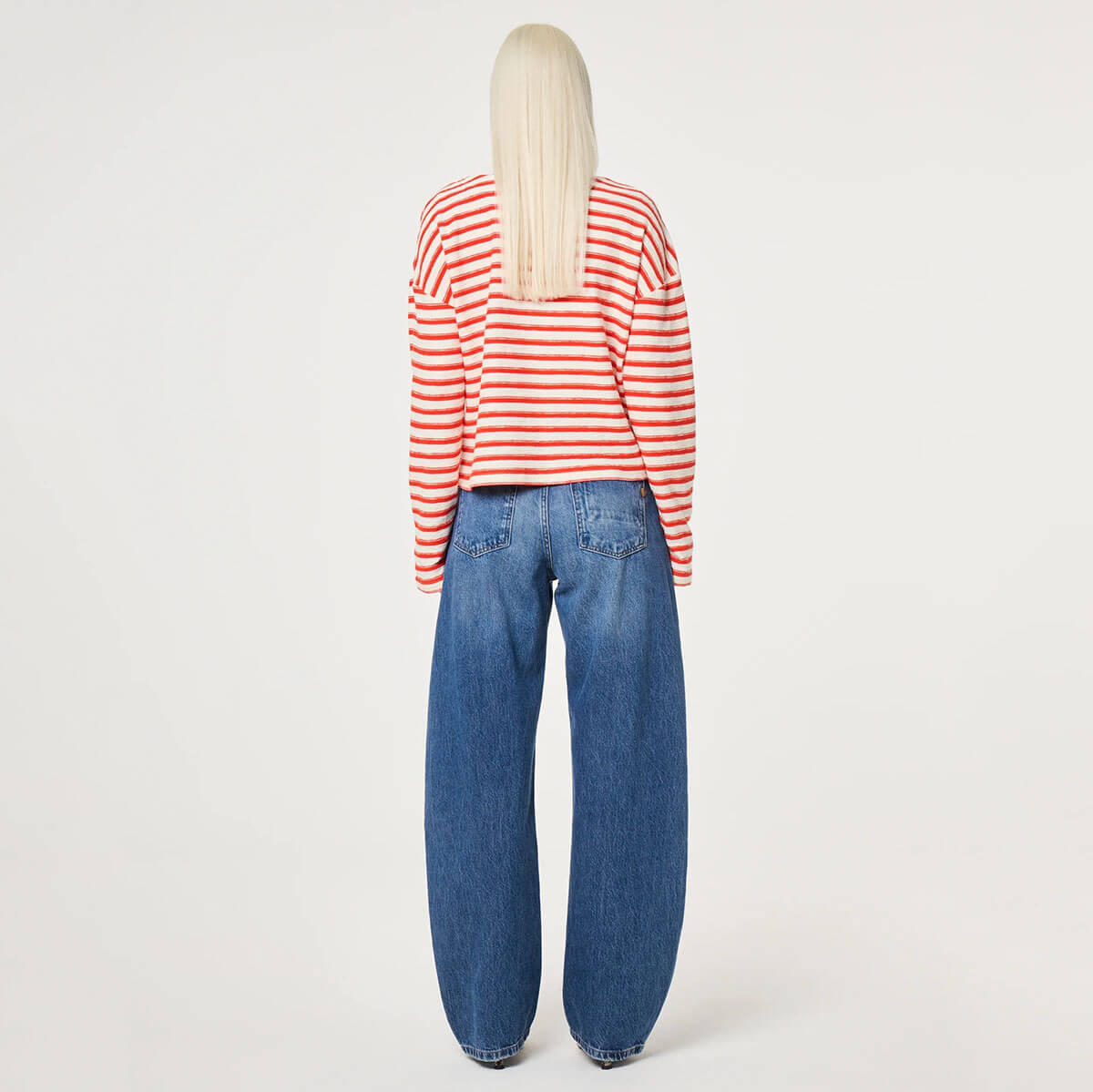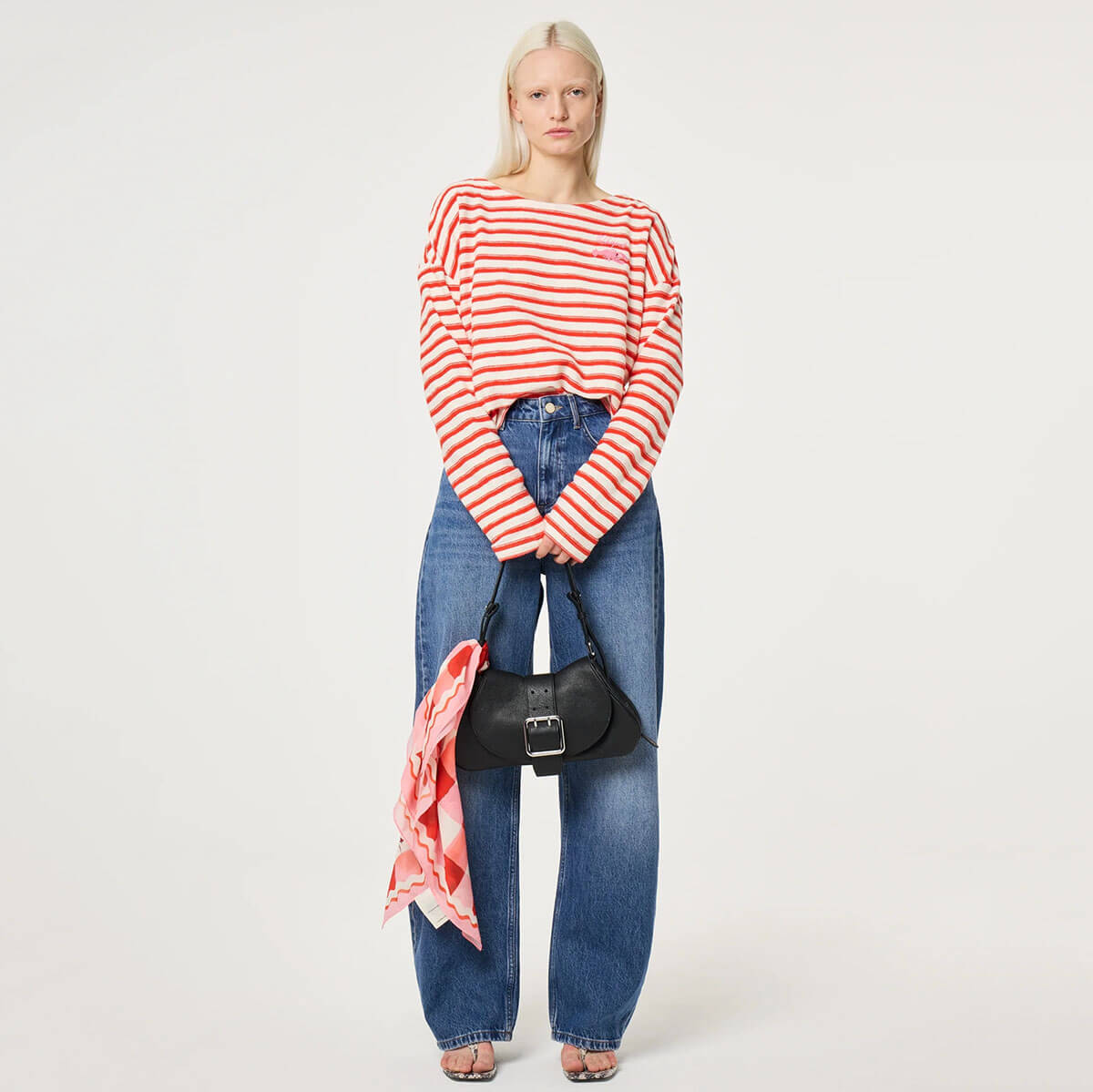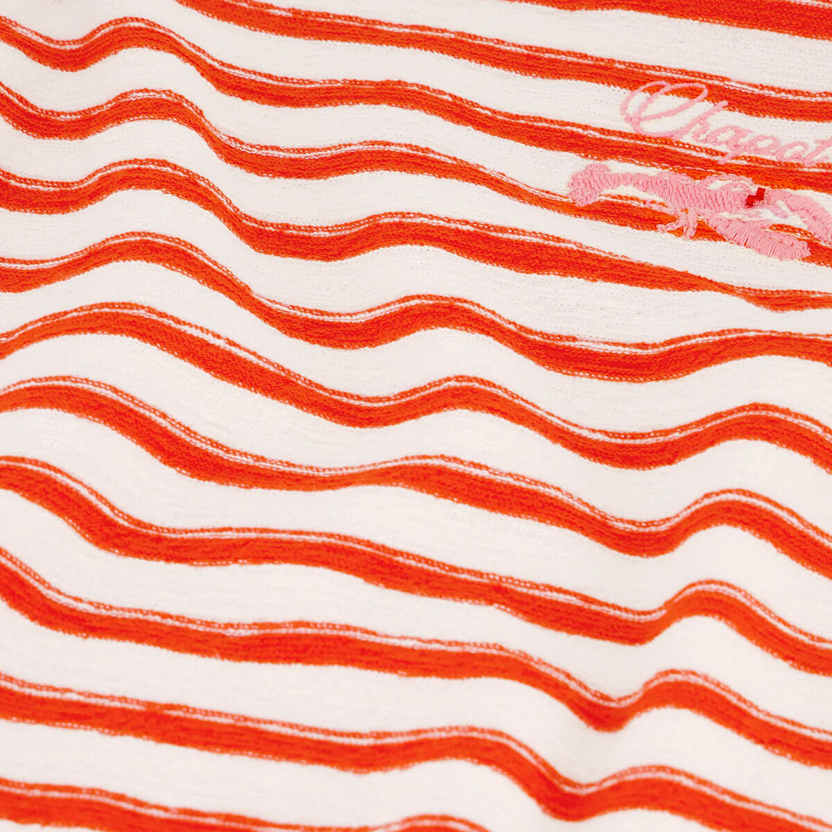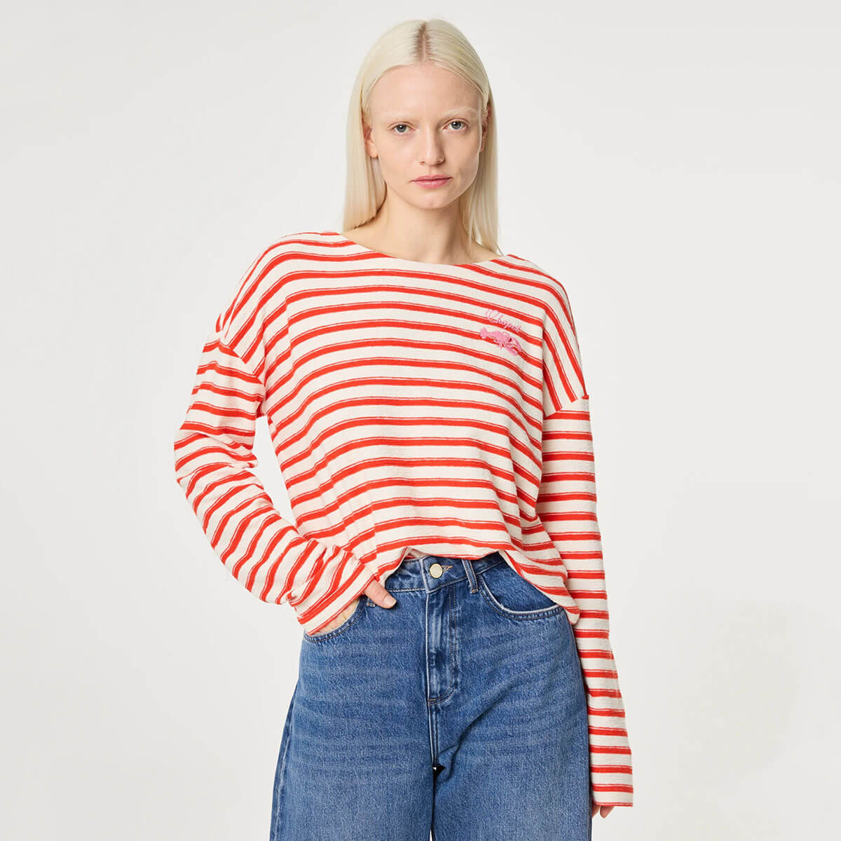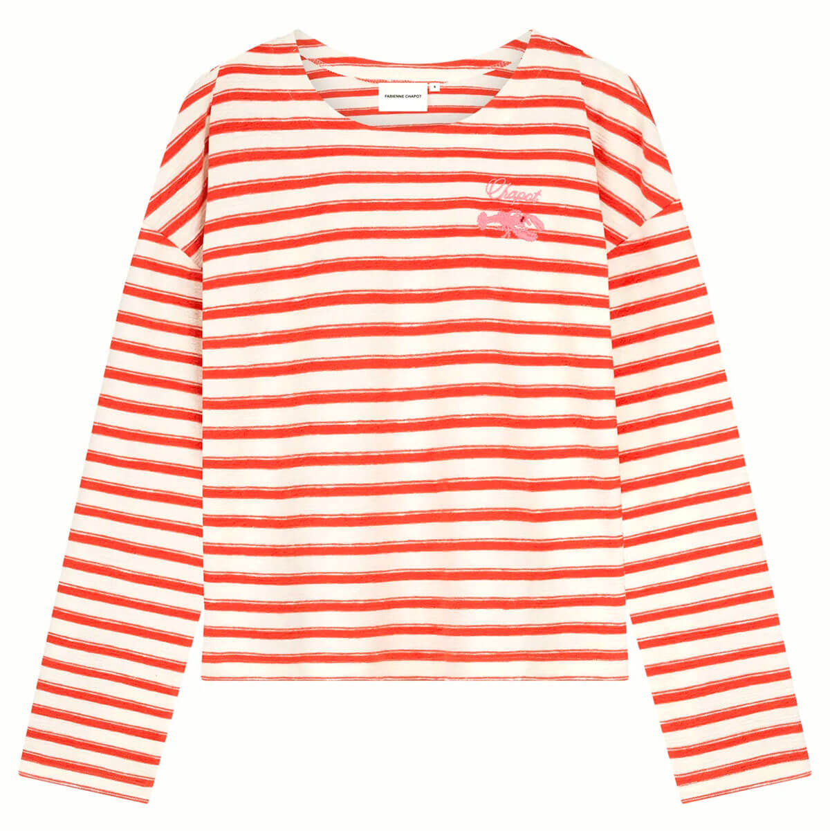 Celina Top by Fabienne Chapot. This long sleeve tee features horizontal orange stripes with a playful lobster detail at the front. Crafted from 100% organic cotton, it offers a soft, breathable feel and a relaxed, loose fit. Finished with a classic round neck, it’s perfect for casual days or adding a whimsical touch to your everyday wardrobe.