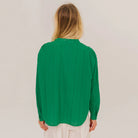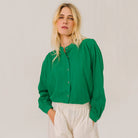 Ella Blouse by Sacrécoeur. Long-sleeved cotton shirt with polka dot stripes, a relaxed fit with gathers at the front and back. Delicate mandarin collar, exposed button fastening and buttoned cuffs for a feminine and flowing silhouette.