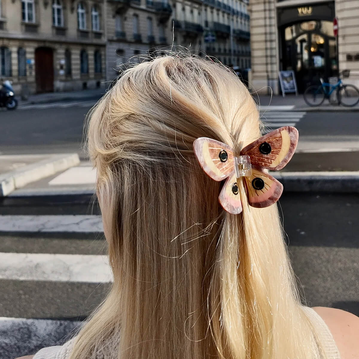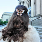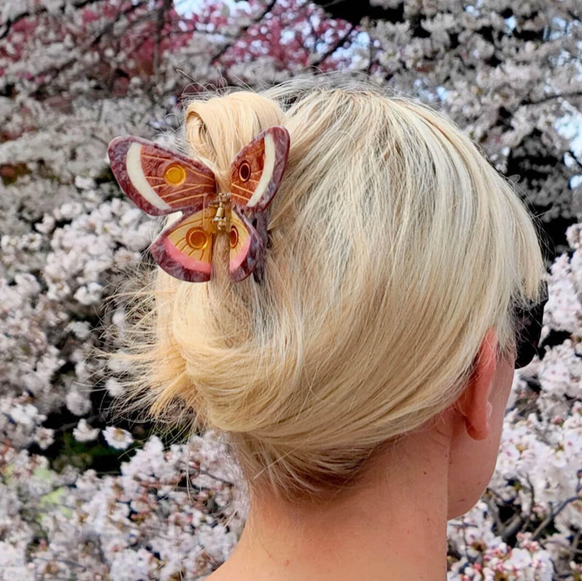 Emperor Silk Moth Hair Claw by Solar Eclipse. Hand-painted by the Solar Eclipse artists, the original emperor silk moth hair claw clip is crafted in small batches. It's designed to upgrade your routine and be treasured for years to come. Designed in New York City, this clip is double-sided, for a perfect look from all angles. Handmade with the signature biodegradable acetate made from recycled wood pulp, it effortlessly holds hair for a secure all-day style. Features an extra strong hinge, promoting long-lasting styles for all-day wear.