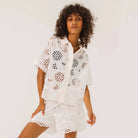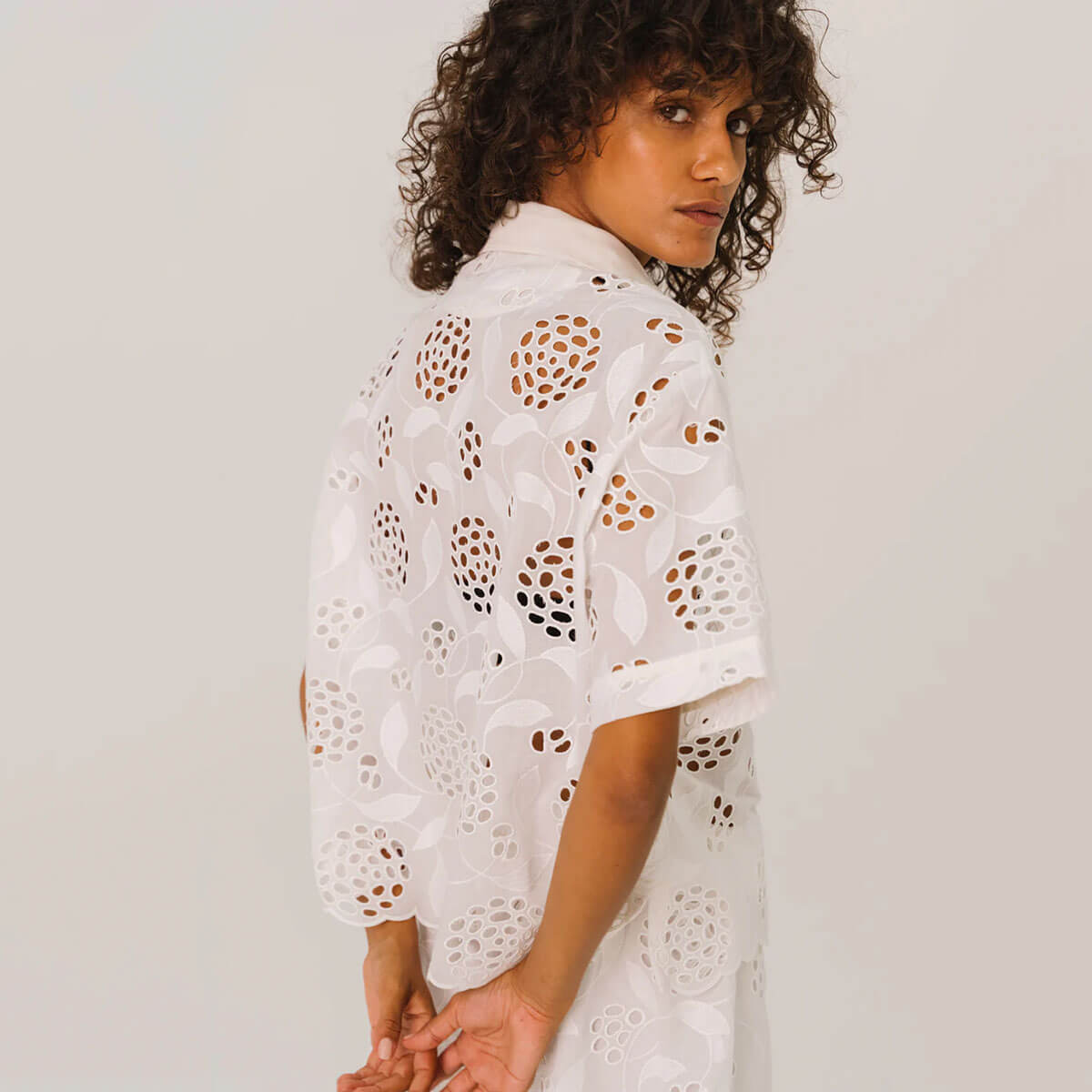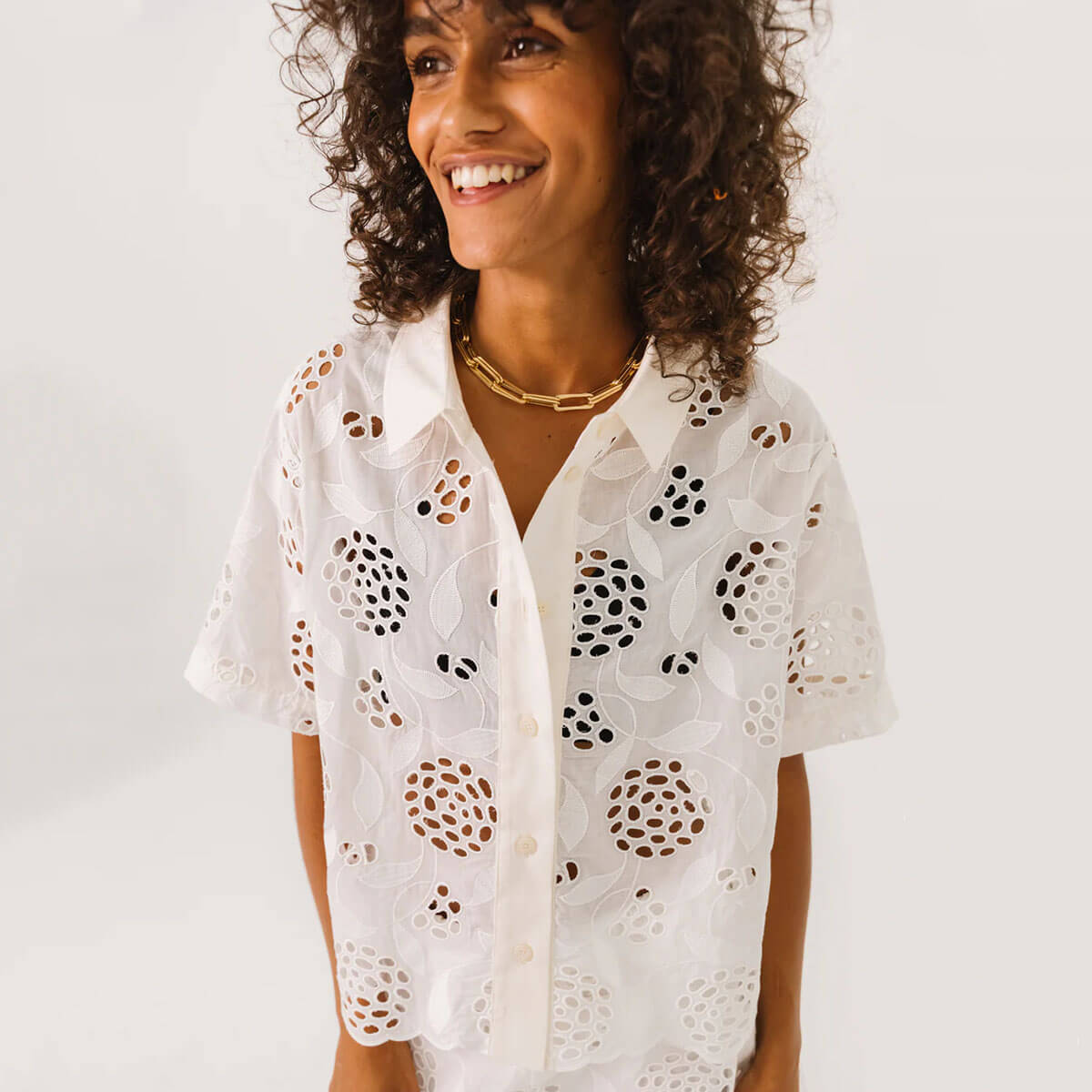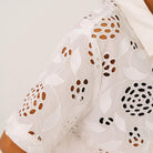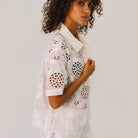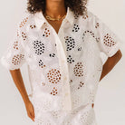 Flavia Flower Shirt by Sacrécoeur. Short-sleeved shirt in eyelet embroidery, fully buttoned at the front. Contrasting button placket for a graphic and modern touch.