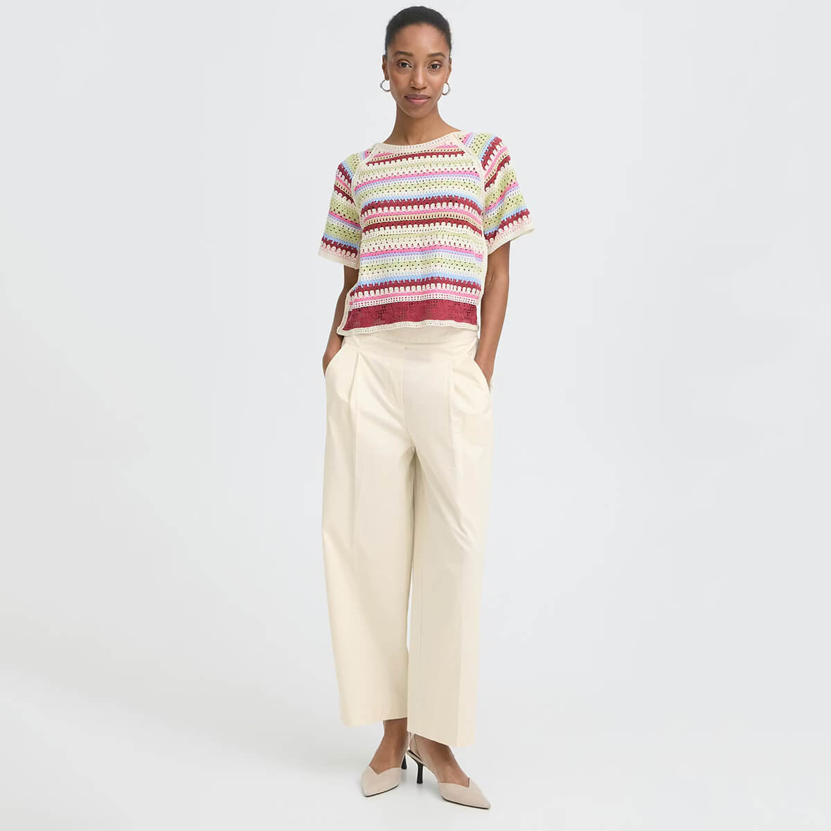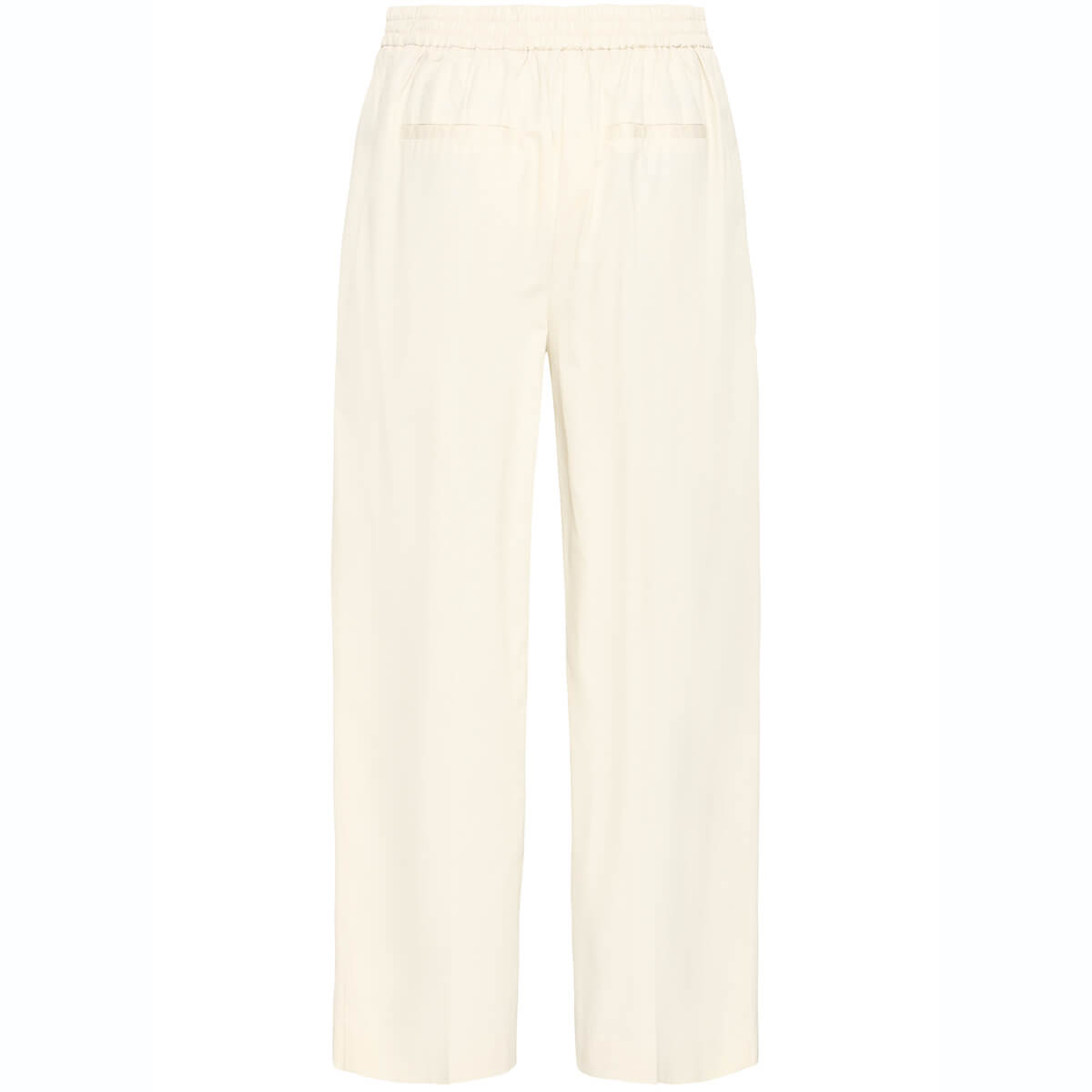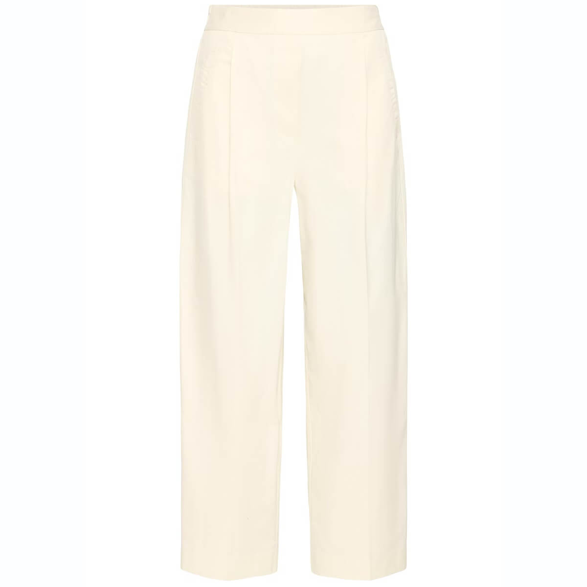 Funi Trousers by ICHI. Wide leg trousers feature a straight, relaxed silhouette and soft finish. Designed with a high waist, pressed front pleats, side pockets, and cropped length for modern structure.