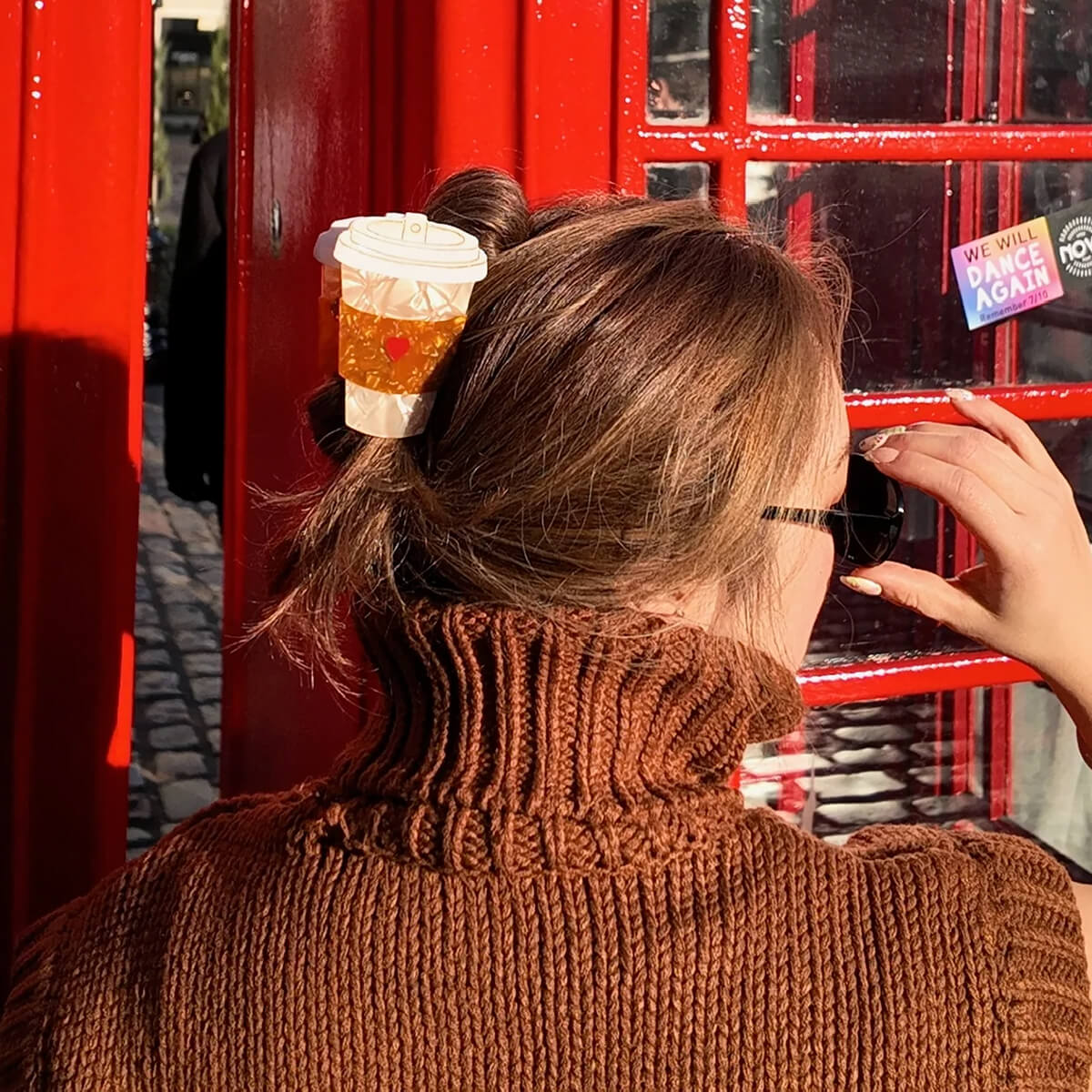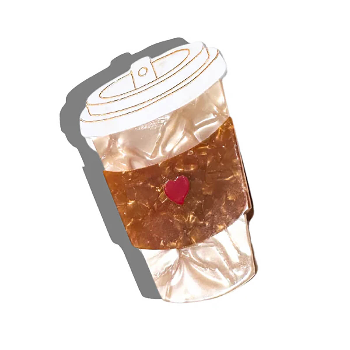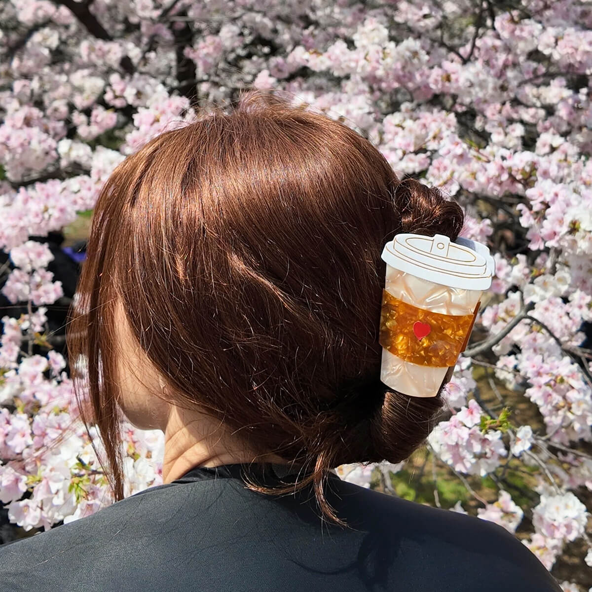 Heart Coffee Cup Hair Claw by Solar Eclipse. Hand-painted by the Solar Eclipse artists, the original heart coffee cup hair claw clip is crafted in small batches. It's designed to upgrade your routine and be treasured for years to come. Designed in New York City, this clip is double-sided, for a perfect look from all angles. Handmade with the signature biodegradable acetate made from recycled wood pulp, it effortlessly holds hair for a secure all-day style. Features an extra strong hinge, promoting long-lasting styles for all-day wear.