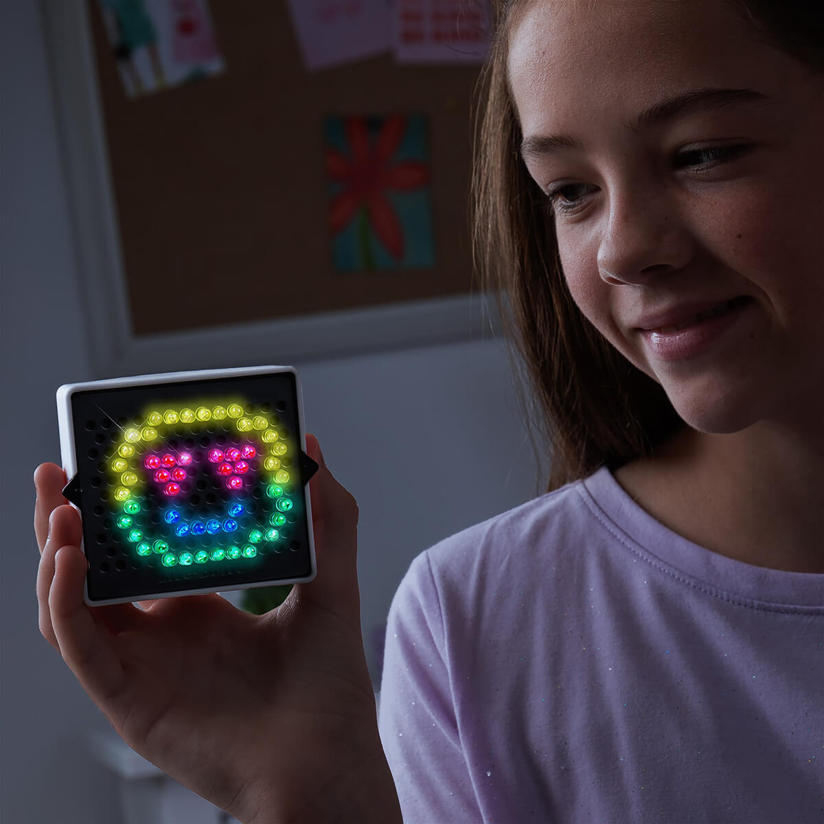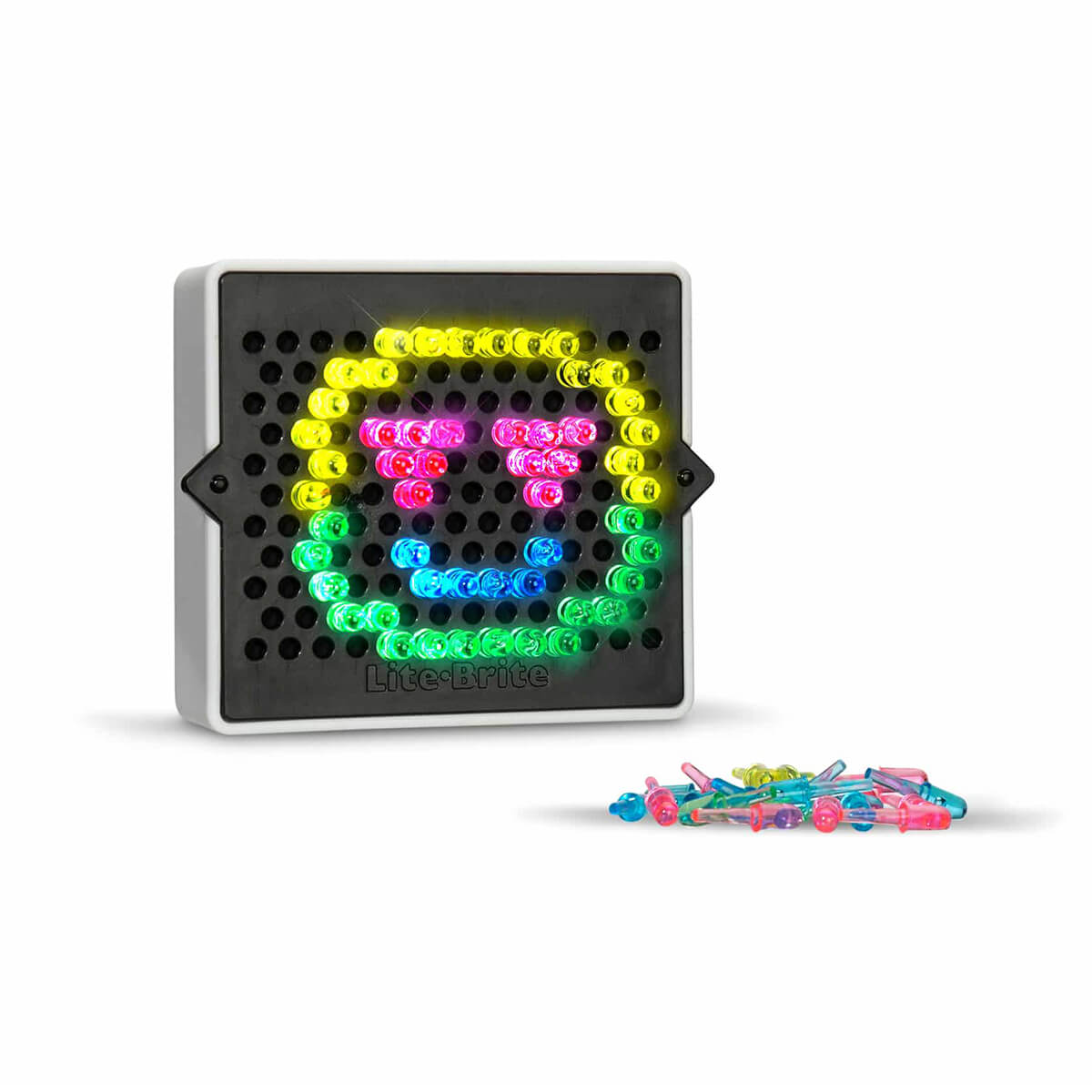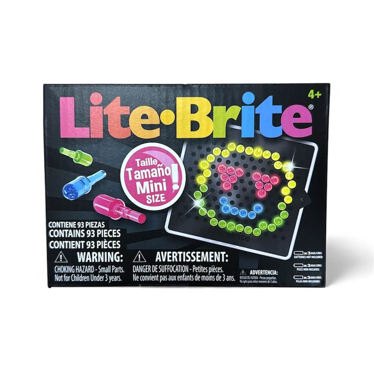 Lite-Brite Mini by Basic Fun. Everyone’s favourite Lite-Brite is now in miniature form! Create art with light using the Lite-Brite Mini, an adorably small version of your favourite classic toy! Inspired by the classic 1980’s Lite-Brite toy, this Lite-Brite Mini includes 6 design templates, 85 colorful mini pegs and a screen that measures 3.5″ wide by 3″ high. Create beautiful art using templates or your own imagination with colorful mini pegs, then light up the screen for a fun display of your artwork! Great for travel and on-the-go!