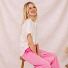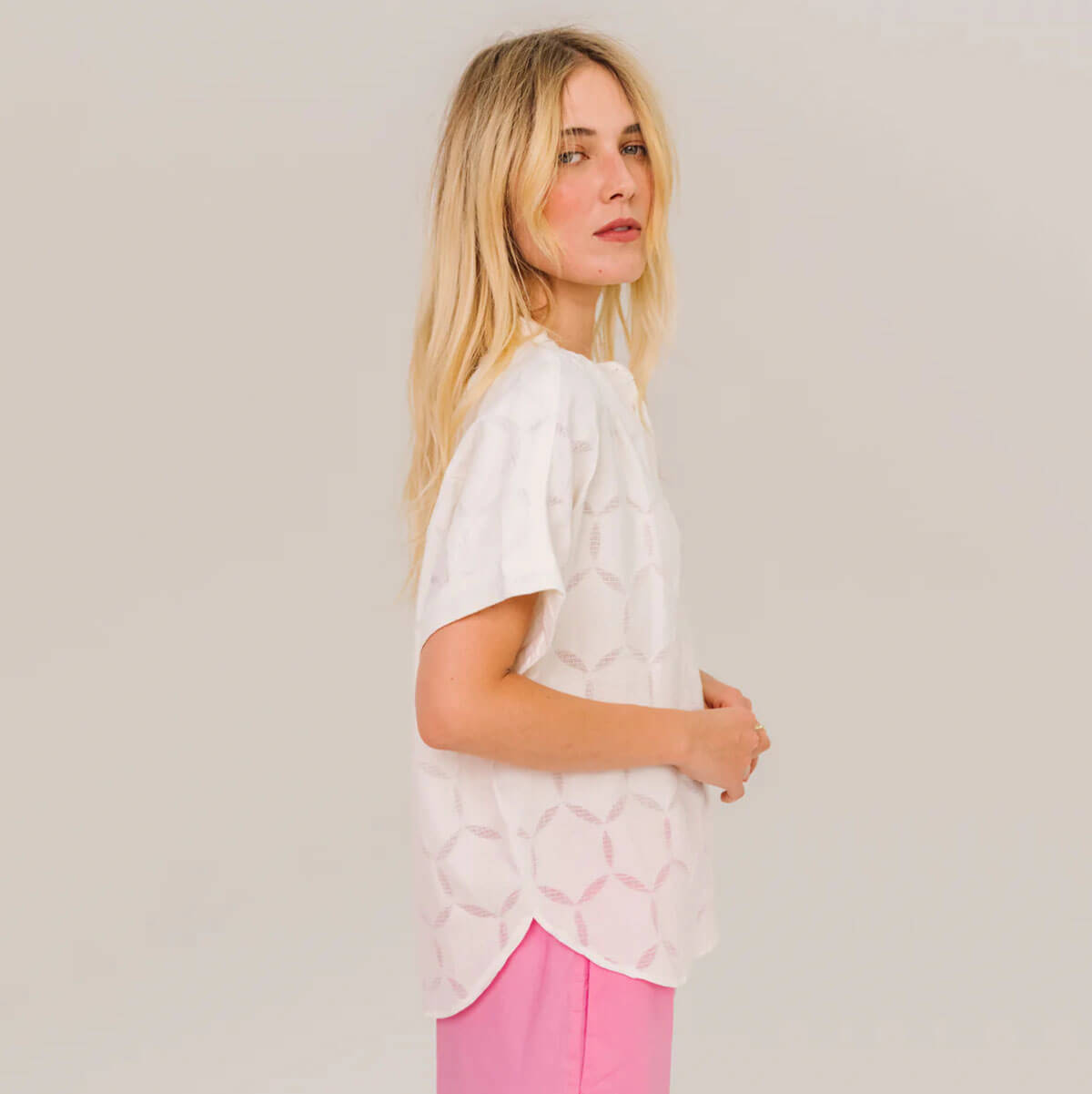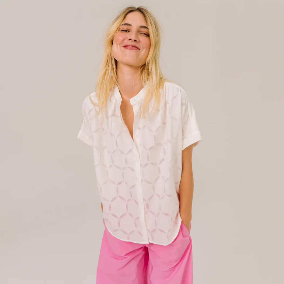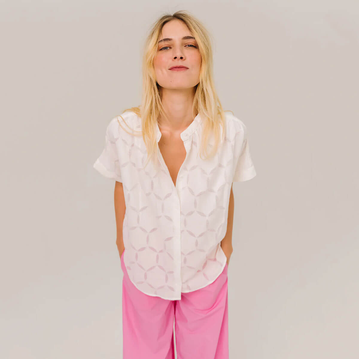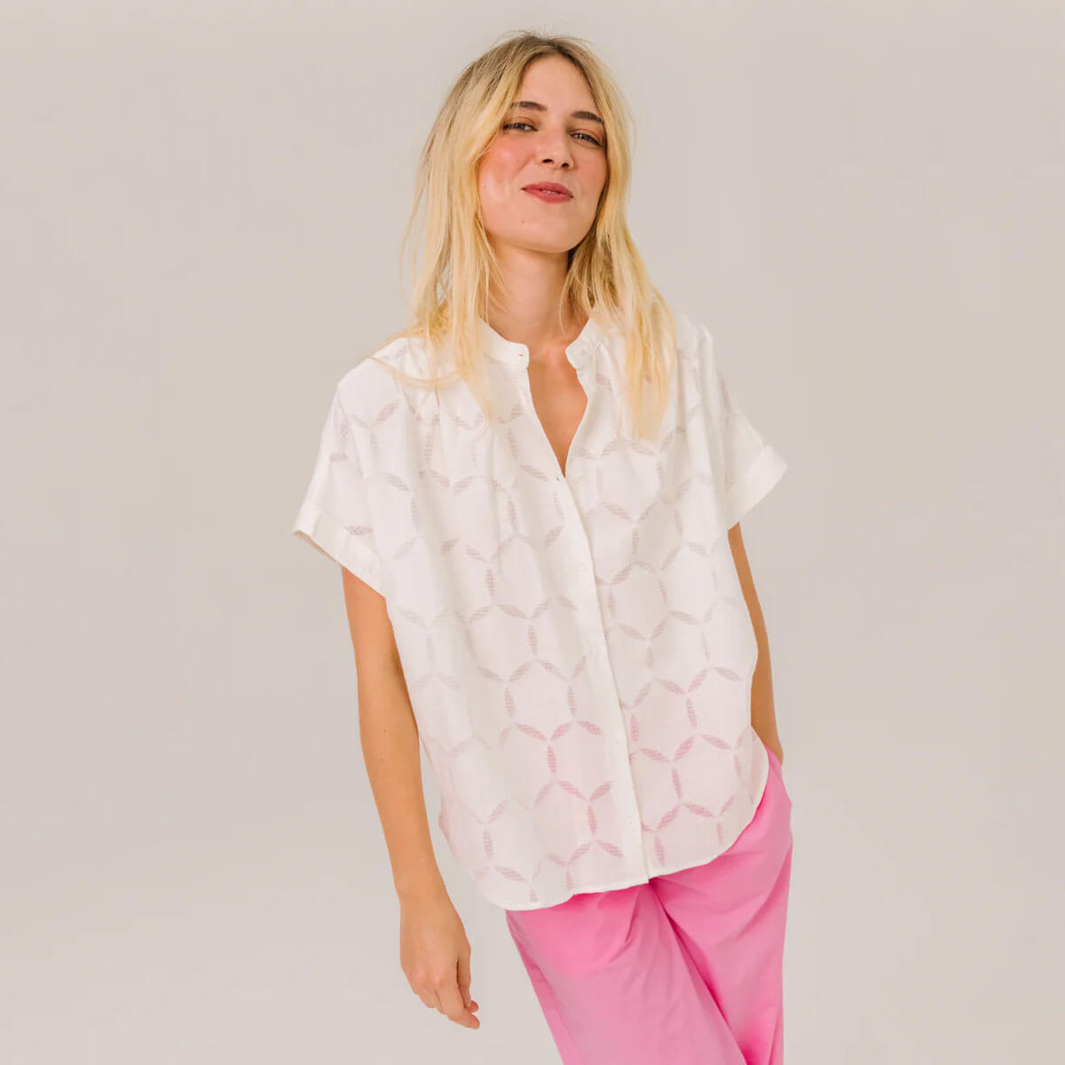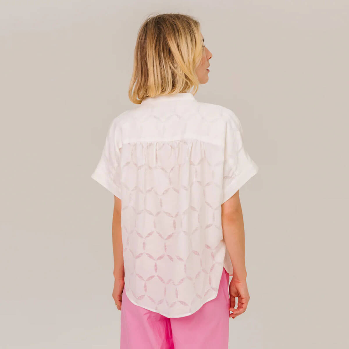Louison Circle Blouse by Sacrécoeur. Short-sleeved blouse with tone-on-tone openwork details. Its loose, flowing cut is enhanced by gathers at the shoulders and back, creating a light and structured silhouette. A slim mandarin collar, exposed buttons, and turn-up cuffs add an elegant and contemporary touch.