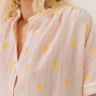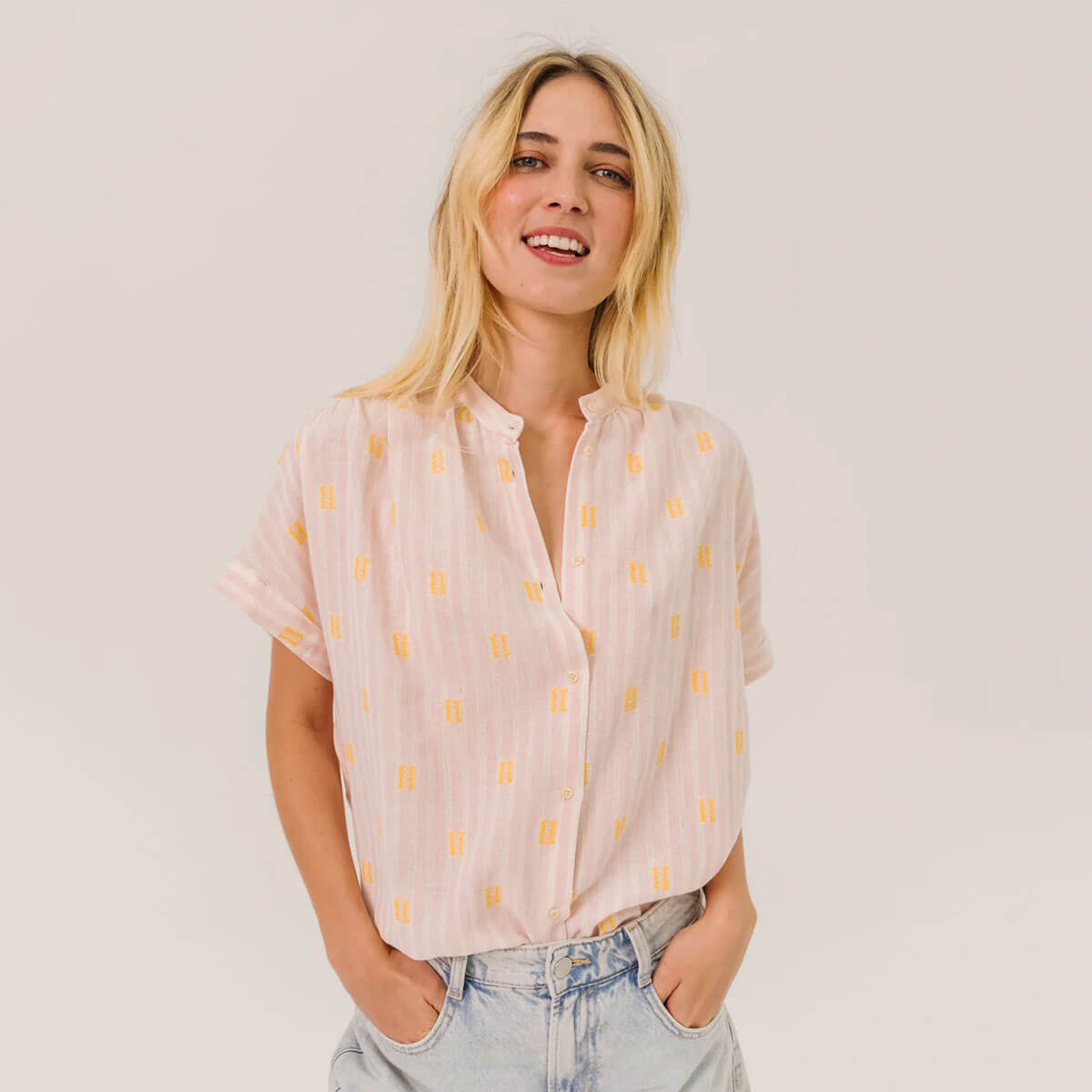 Louison Jerico Blouse by Sacrécoeur. Short-sleeved blouse with a woven pattern. Its loose, flowing cut is enhanced by gathers at the shoulders and back, creating a light and structured silhouette. A slim mandarin collar, exposed buttons, and turn-up cuffs add an elegant and contemporary touch.