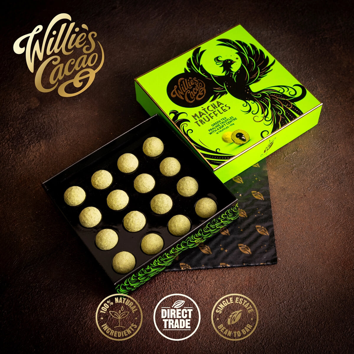 Matcha Truffles by Willie's Cacao. Burst through emerald green Matcha truffle into a dreamy liquid centre. What a way to discover this celebrated Kotobuki green tea, from Uji the home of Matcha.
