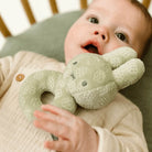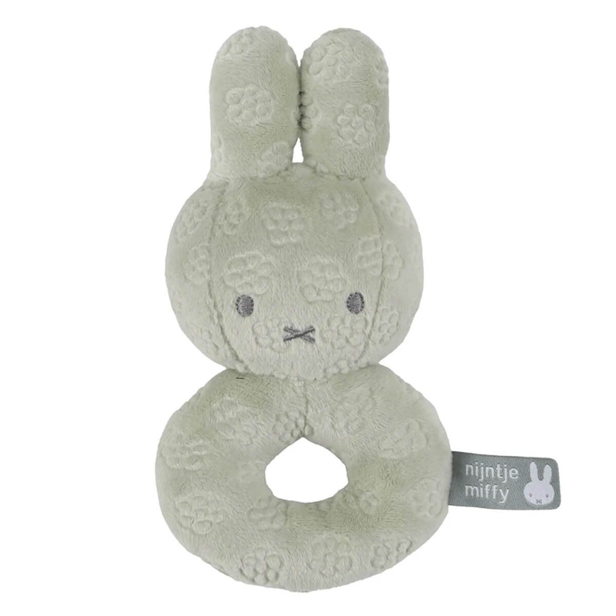 Miffy Rattle in Green Flower by Little Dutch. This pretty rattle is made from super soft fabric with an embossed flower print. It fits perfectly into small hands and makes a gentle rattling sound.