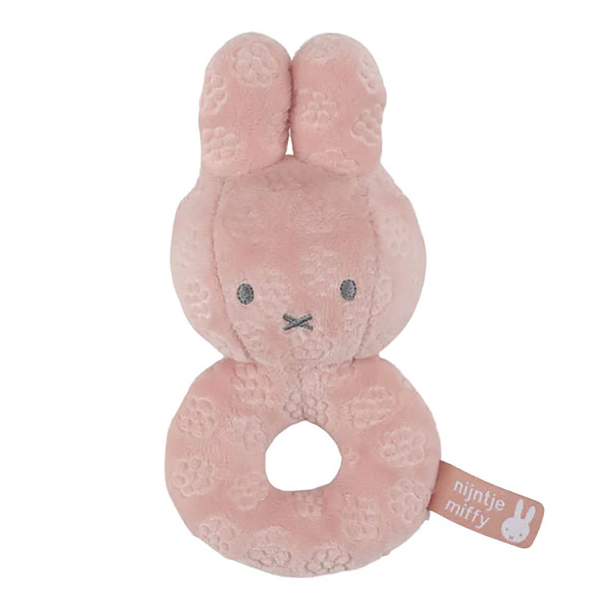 Miffy Rattle in Pink Flower by Little Dutch. This pretty rattle is made from super soft fabric with an embossed flower print. It fits perfectly into small hands and makes a gentle rattling sound.