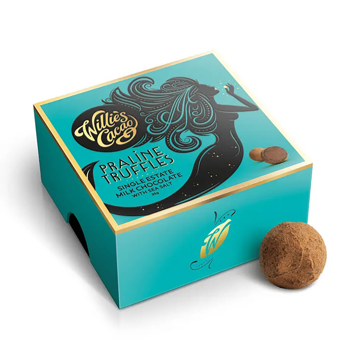 Milk Chocolate Praline Truffles by Willie's Cacao. The taste of pure decadence. Luxury chocolate truffles made with rich single estate milk chocolate, freshly roasted hazelnuts and a pinch of Cornish Sea Salt, dipped in chocolate and dusted with cocoa powder. Willie's Cacao make everything themselves, not just the nutty Sur del Lago chocolate. So, they roast the hazelnuts to capture their flavour at its freshly roasted peak and press the cocoa powder on our beautiful old Spanish cocoa butter press. Everything is totally natural, with no artificial anything.