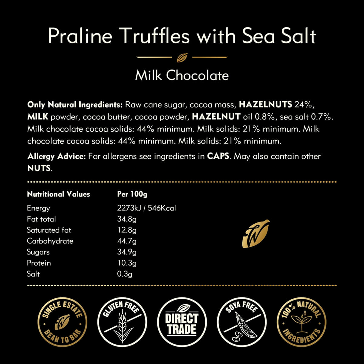 Milk chocolate Praline Truffles with Sea Salt. Milk chocolate cocoa solids: 44% minimum. Milk solids: 21% minimum.