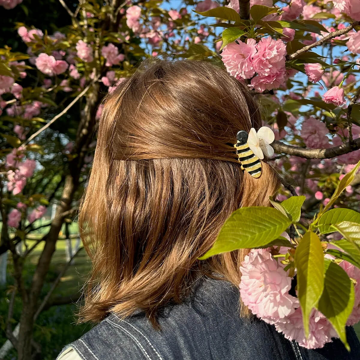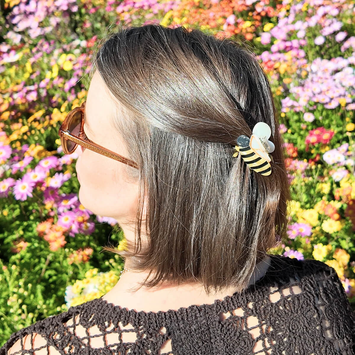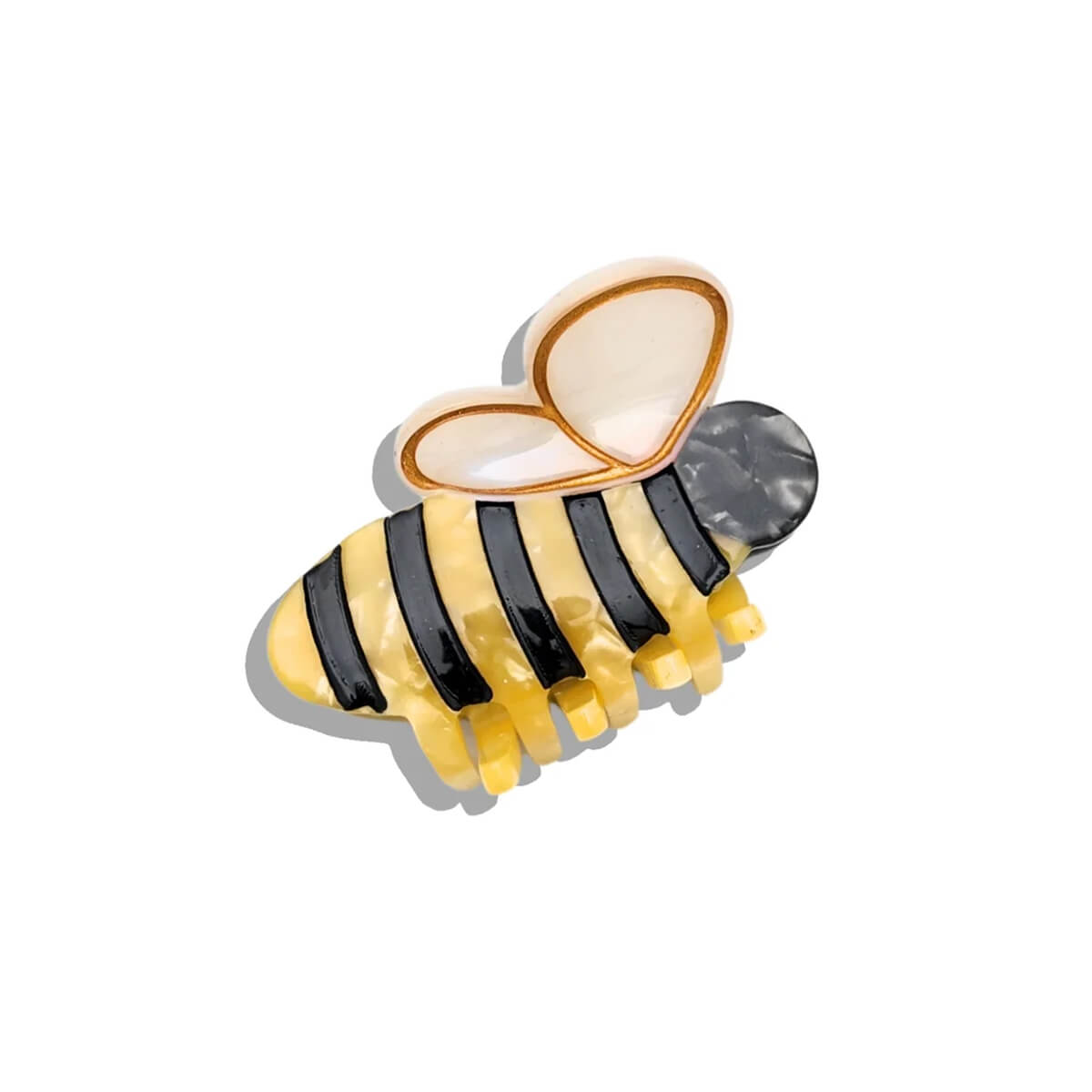 Mini Bee Hair Claw by Solar Eclipse. Hand-painted by the Solar Eclipse artists, the original mini bee hair claw clip is crafted in small batches. It's designed to upgrade your routine and be treasured for years to come. Designed in New York City, this clip is double-sided, for a perfect look from all angles. Handmade with the signature biodegradable acetate made from recycled wood pulp, it effortlessly holds hair for a secure all-day style. Features an extra strong hinge, promoting long-lasting styles for all-day wear.
