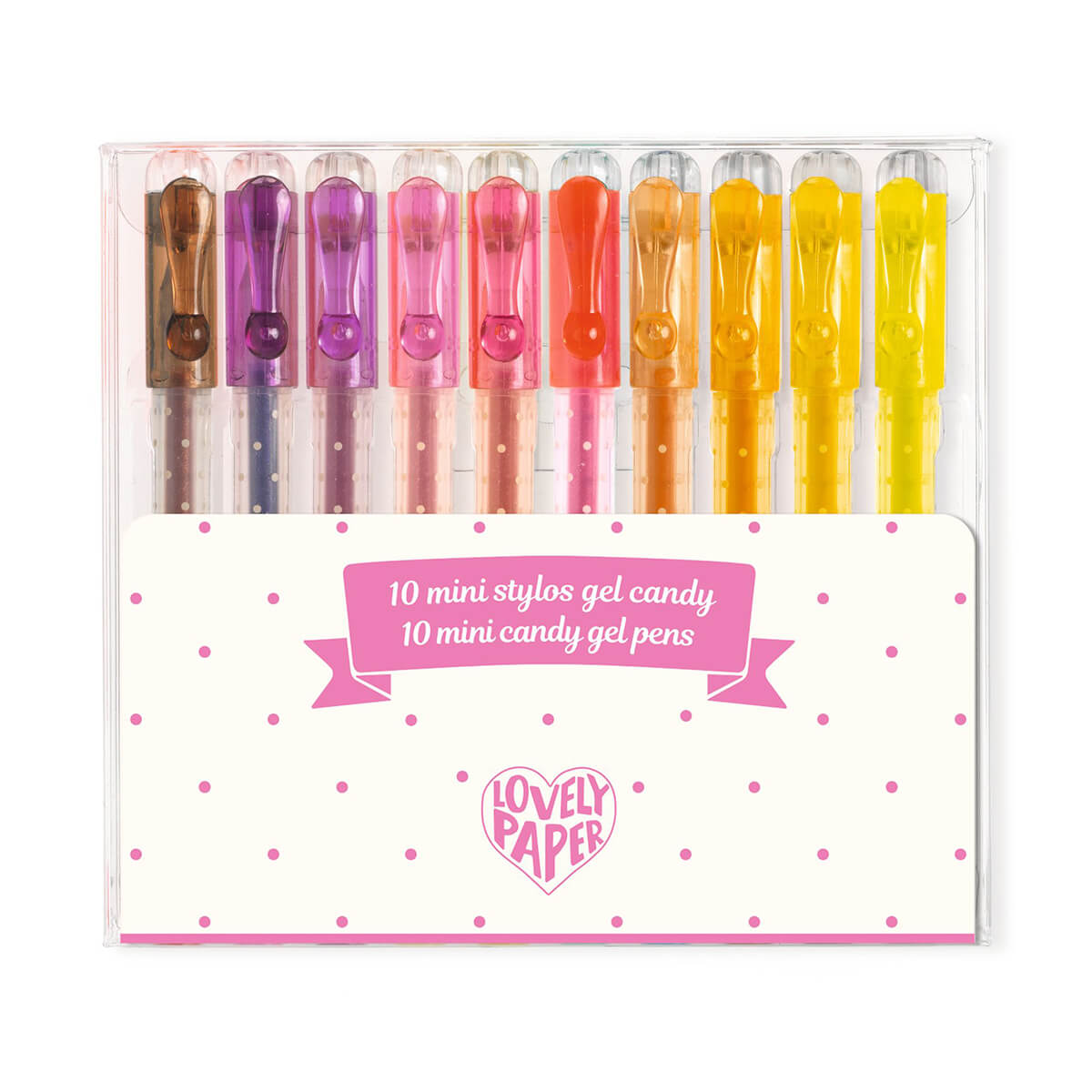Mini Candy Gel Pens by Djeco. A set of 10 mini candy gel pens in a transparent case to enhance your creations!