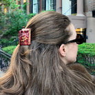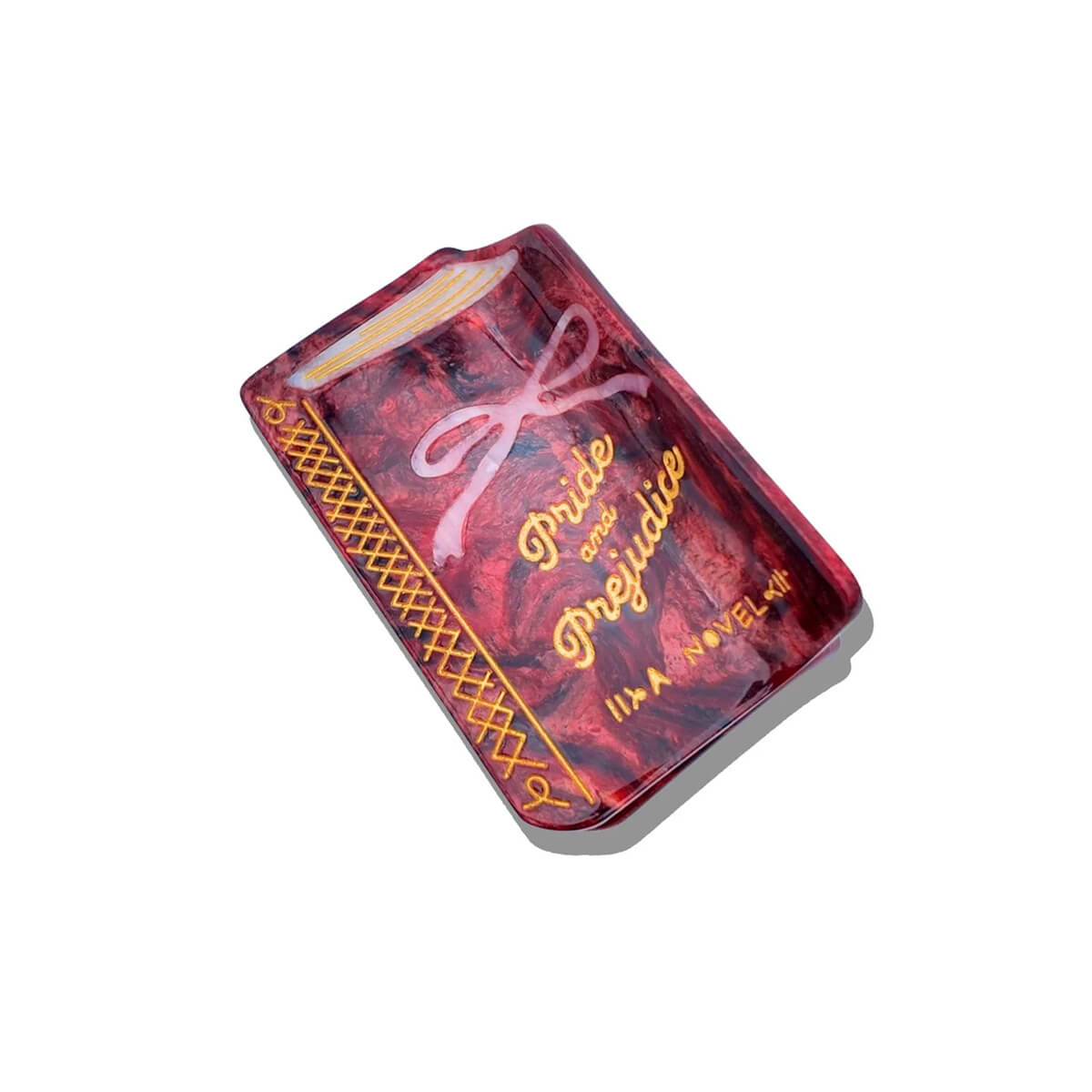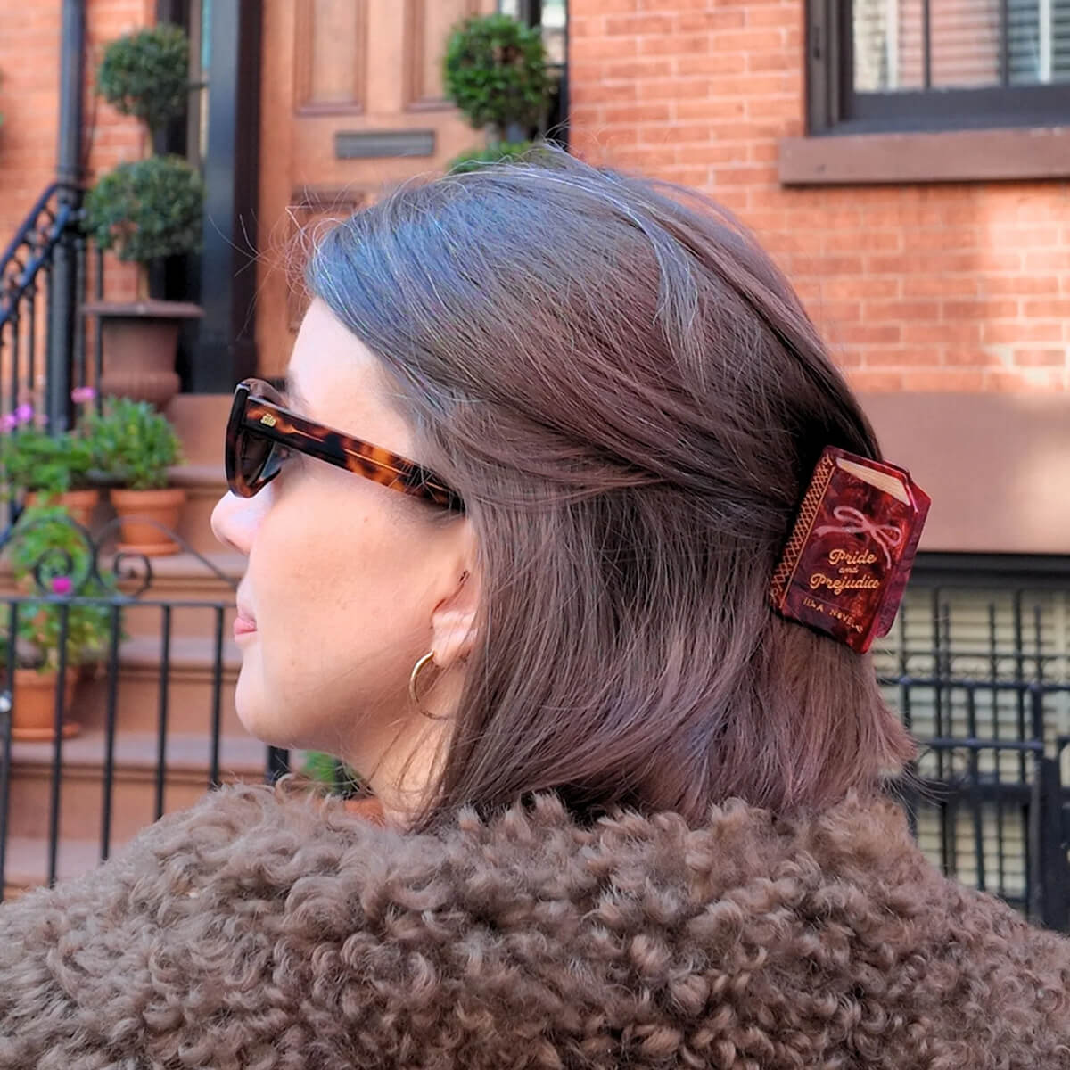 Mini Pride & Prejudice Book Hair Claw by Solar Eclipse. Hand-painted by the Solar Eclipse artists, the original Pride & Prejudice book hair claw clip is crafted in small batches. It's designed to upgrade your routine and be treasured for years to come. Designed in New York City, this clip is double-sided, for a perfect look from all angles. Handmade with the signature biodegradable acetate made from recycled wood pulp, it effortlessly holds hair for a secure all-day style. Features an extra strong hinge, promoting long-lasting styles for all-day wear.