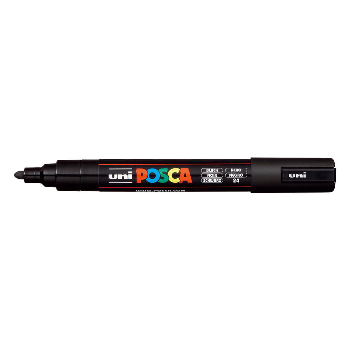 PC-5M in Black by Posca. Water based paint marker pen. The PC-5M's versatile bullet tip is the most popular size and shape of any Posca marker pen. Providing a clear, precise line and beautiful colour, it is ideal for customising porous, irregular surfaces such as wood, stone or concrete. Posca pens can also draw on glass and windows and be removed with warm soapy water.