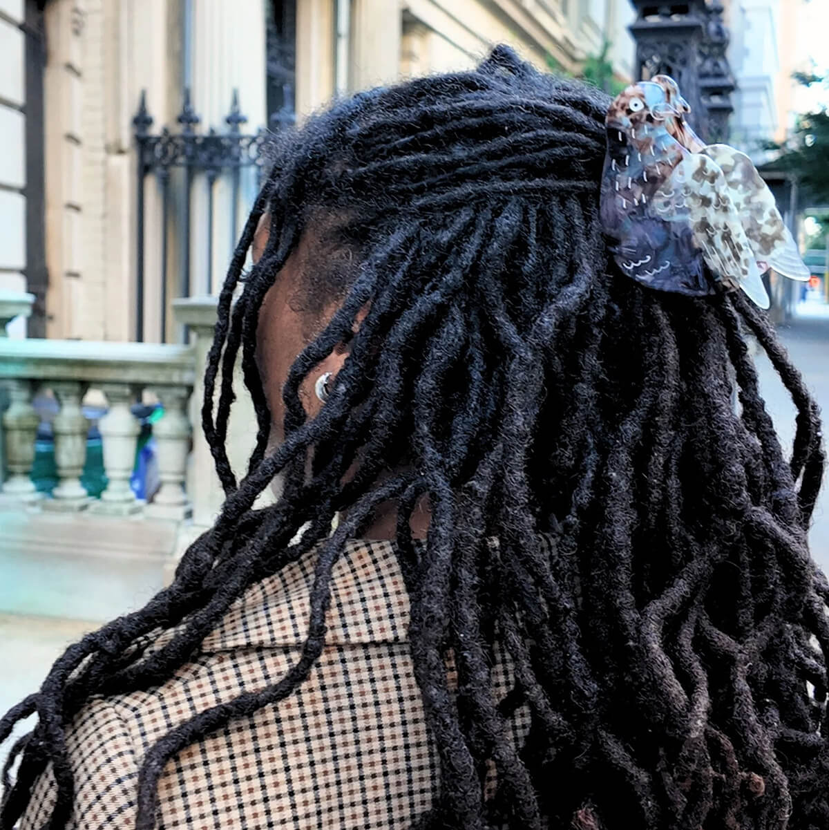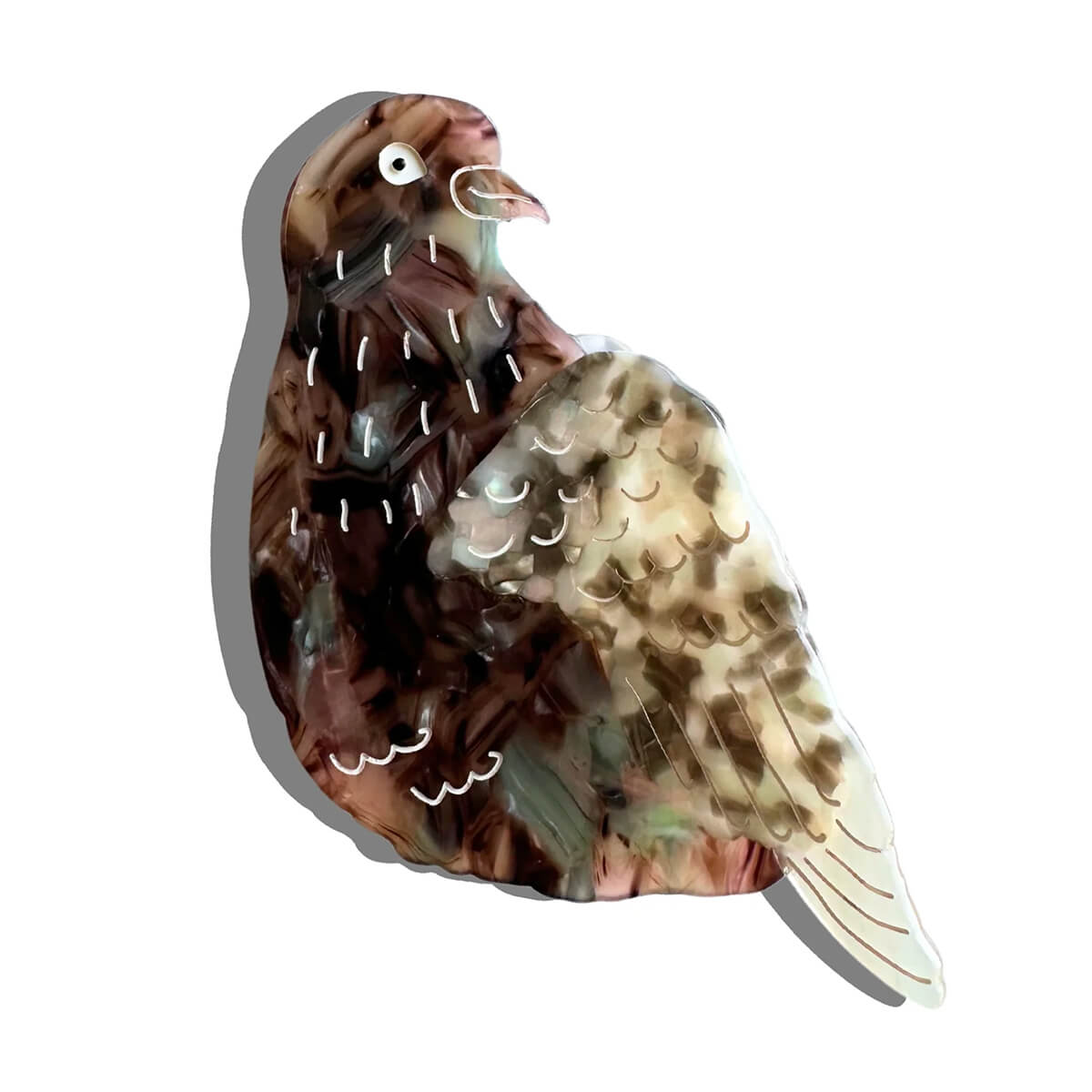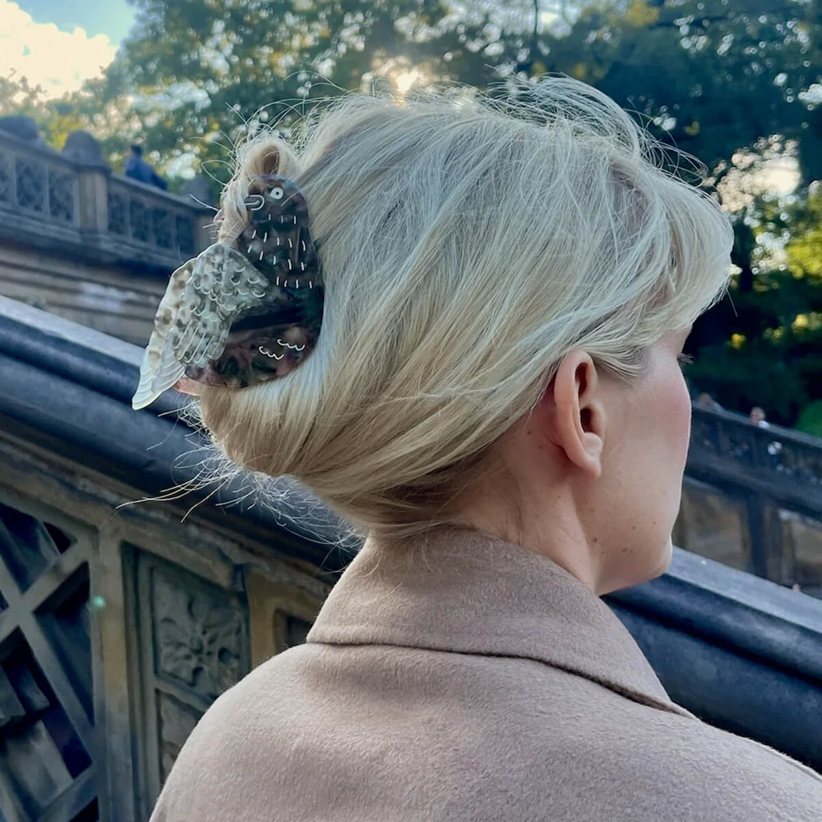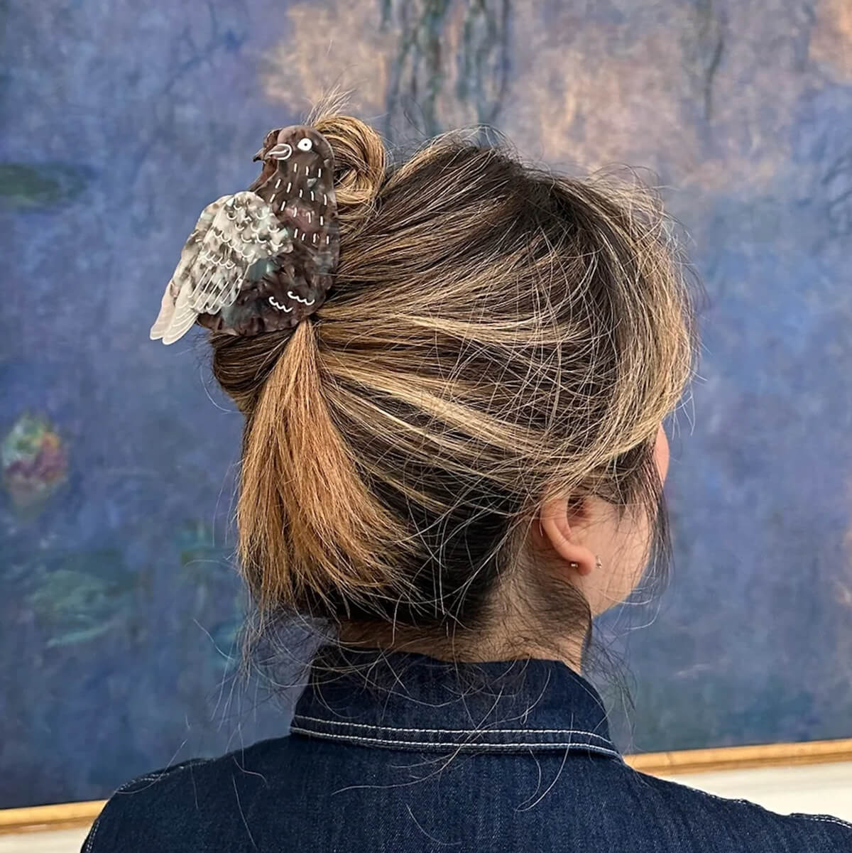 Pigeon Hair Claw by Solar Eclipse. Hand-painted by the Solar Eclipse artists, the original pigeon hair claw clip is crafted in small batches. It's designed to upgrade your routine and be treasured for years to come. Designed in New York City, this clip is double-sided, for a perfect look from all angles. Handmade with the signature biodegradable acetate made from recycled wood pulp, it effortlessly holds hair for a secure all-day style. Features an extra strong hinge, promoting long-lasting styles for all-day wear.