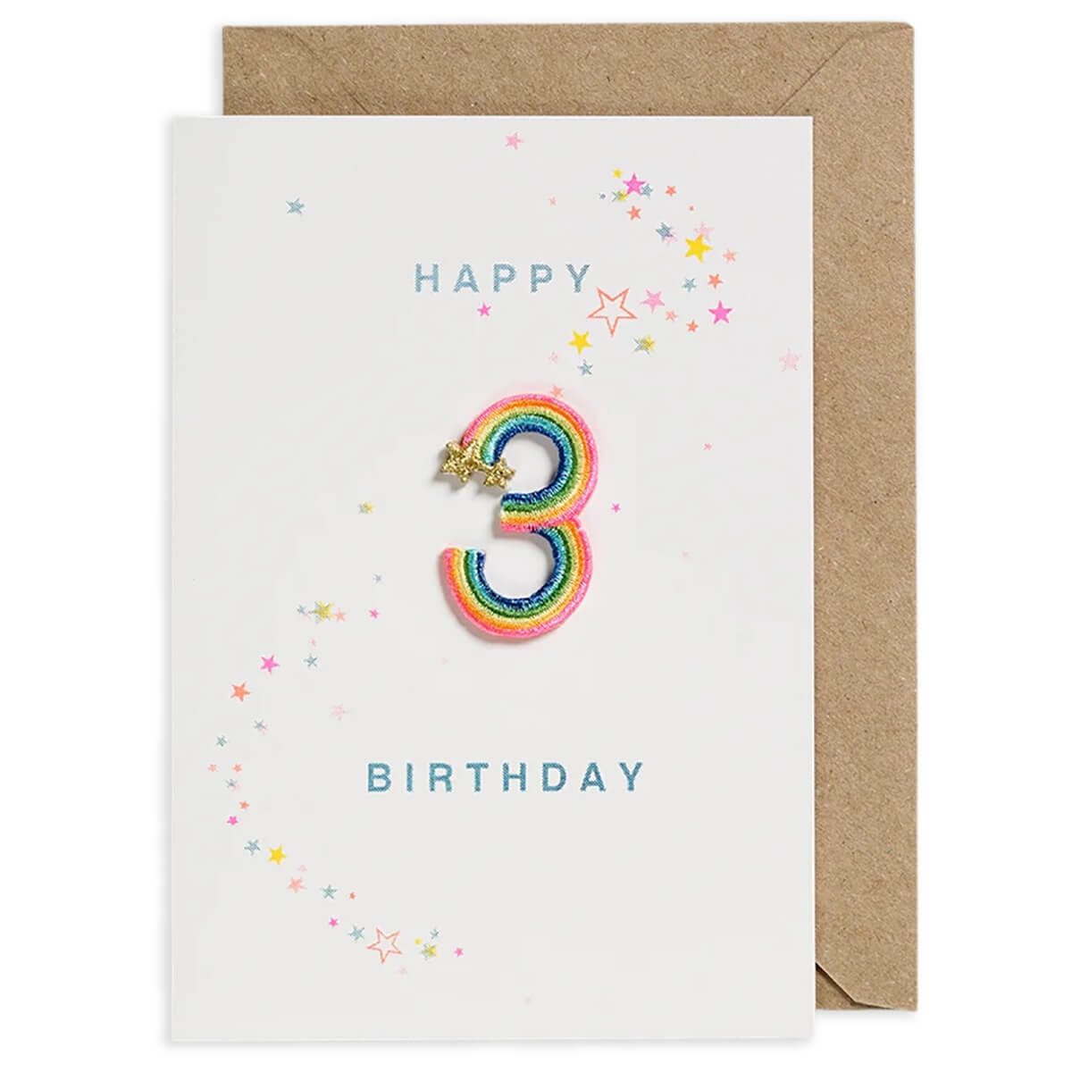 Rainbow embroidered age greetings card by Petra Boase. Printed third birthday card featuring a richly embroidered colourful number patch.  The patch has an iron-on backing so can be removed from the card and ironed on to a favourite t-shirt, rucksack or whatever you like! Blank inside for your own message.