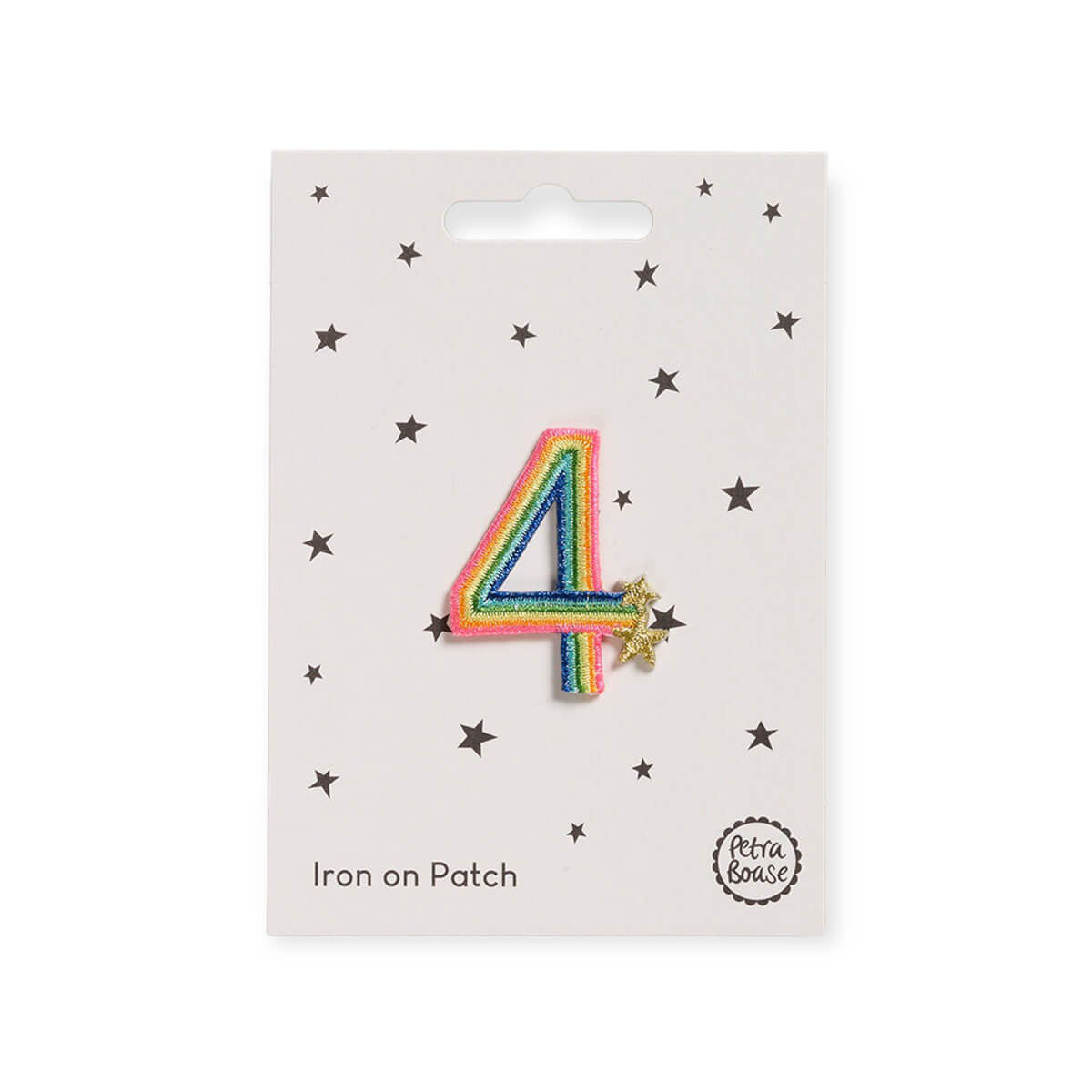 Rainbow Number 4 iron on patch by Petra Boase. Richly embroidered colourful rainbow number patch, with an iron-on backing so can be removed from the card and ironed on to a favourite t-shirt, rucksack or whatever you like!