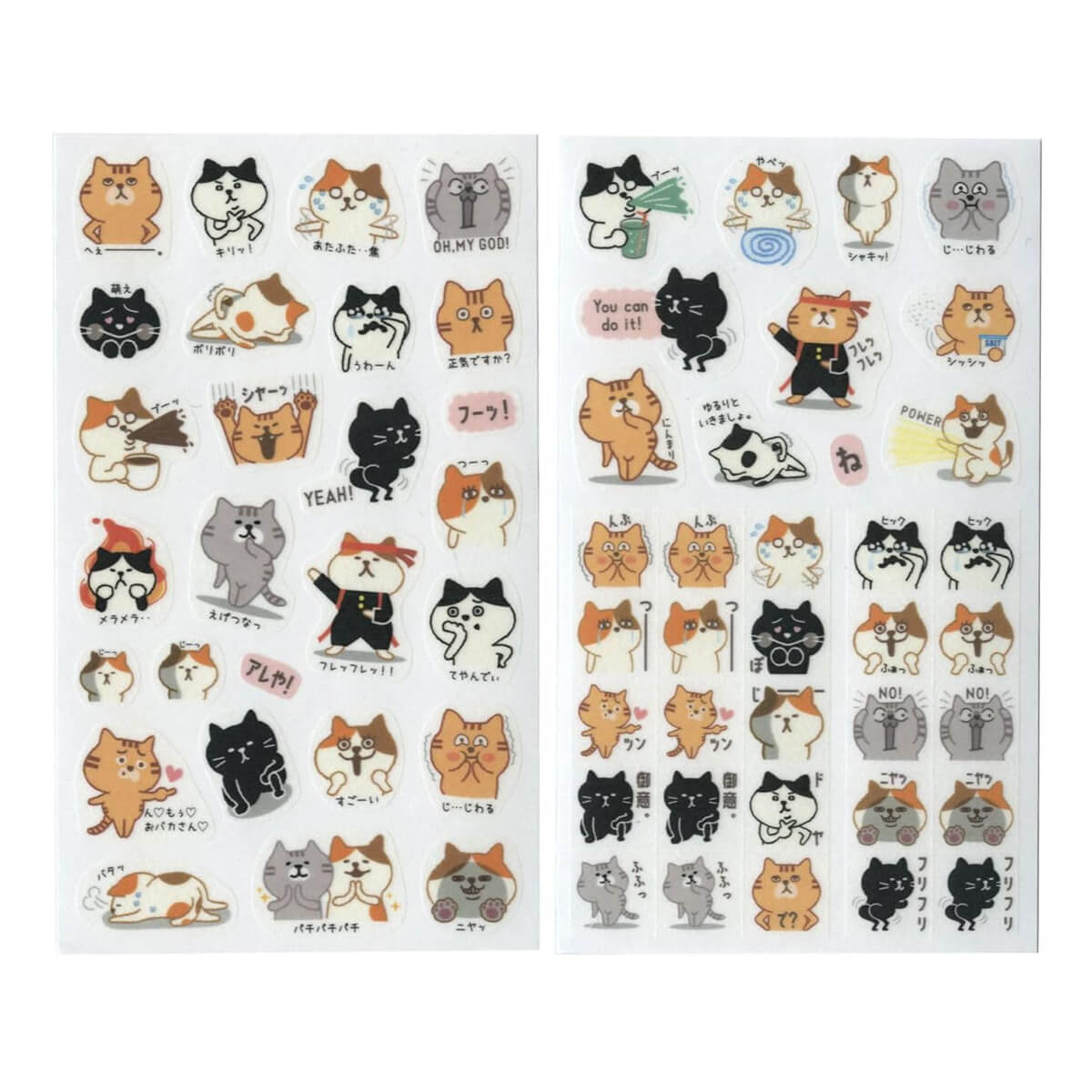Reaction Cat Masking Stickers by Pine Book Japan. These comical cats are the perfect addition to your stationery collection! Full of amusing characters reacting to daily life, they will be sure to make you chuckle.