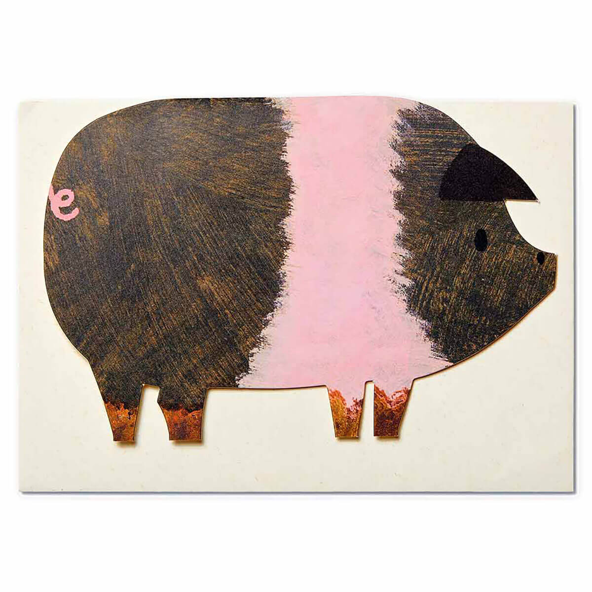 Striped Pig Greetings Card by Mortlake Papers. This striped pig card features bold, characterful artwork by award-winning designer Alice Lickens, reproduced on recycled paper and die-cut into the playful shape of a pig. With its cheerful expression and eye-catching stripes, the pig illustration appeals to children, dads, and food lovers alike. Blank inside, this greeting card is ideal as a kids birthday card, Father’s Day card, or a thoughtful gift for a foodie, chef or farm shop customer, simply add a handwritten message to personalise.
