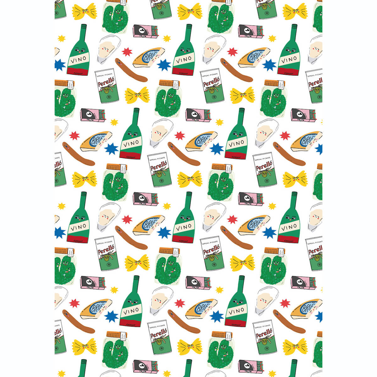 The Deli Gift Wrap by Eat The Moon. Single sheet of wrapping paper adorned with all your favourite deli items. Printed and designed in the UK on high quality FCS approved uncoated 100gsm paper.