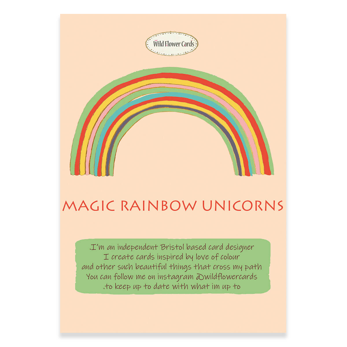 Unicorns And Rainbows greetings card by Wildflower Cards. Features an illustration by Grainne Thompson on both the front and back of the card. Blank inside with cream envelope.
