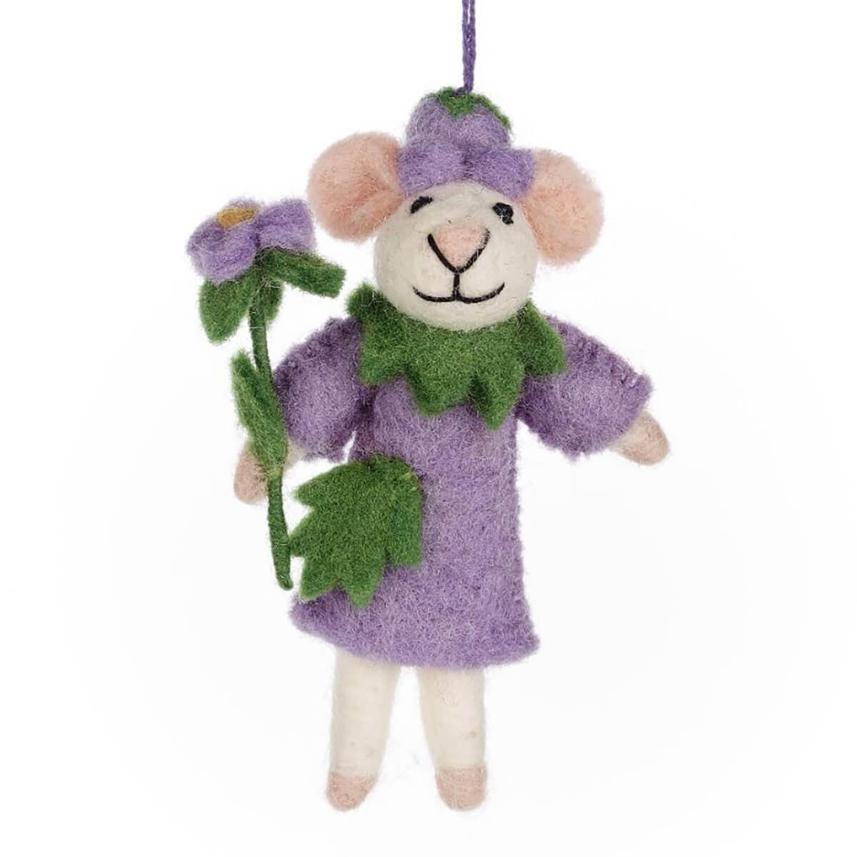 Violet The Mouse hanging decoration by Felt So Good. This sweet mouse has a felted purple outfit and is carrying a lilac Spring flower. This lovely hand-felted decoration is perfect for hanging on your Easter tree, as part of an Easter Egg hunt or for decorating the home in Spring.