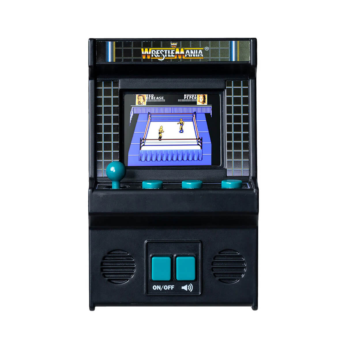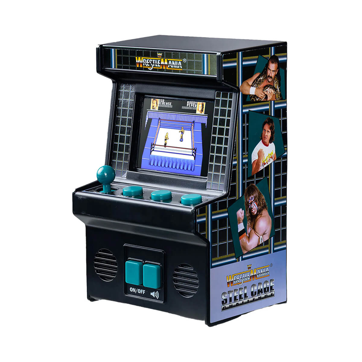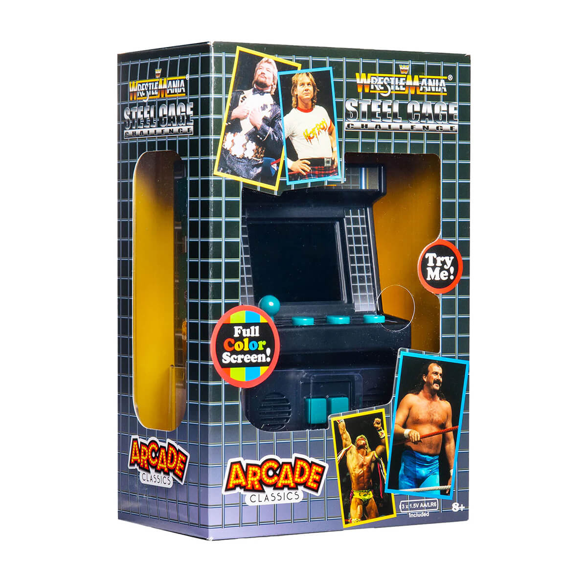 WWE Wrestle Mania Steel Cage Challenge Mini Arcade Game by Hasbro. Step into the ring with the Arcade Classics WWE WrestleMania: Steel Cage Challenge mini arcade machine! Relive the golden era of wrestling with 10 iconic WWE legends, including Hulk Hogan, Undertaker and Ultimate Warrior. Battle it out in the steel cage with classic slam, grapple, and climb gameplay true to the original arcade hit. Featuring authentic joystick controls, retro pixel graphics, and vintage entrance themes and sound effects, this mini arcade delivers all the over-the-top excitement of the classic matches. The bright full-colour screen makes every moment of the action come alive!