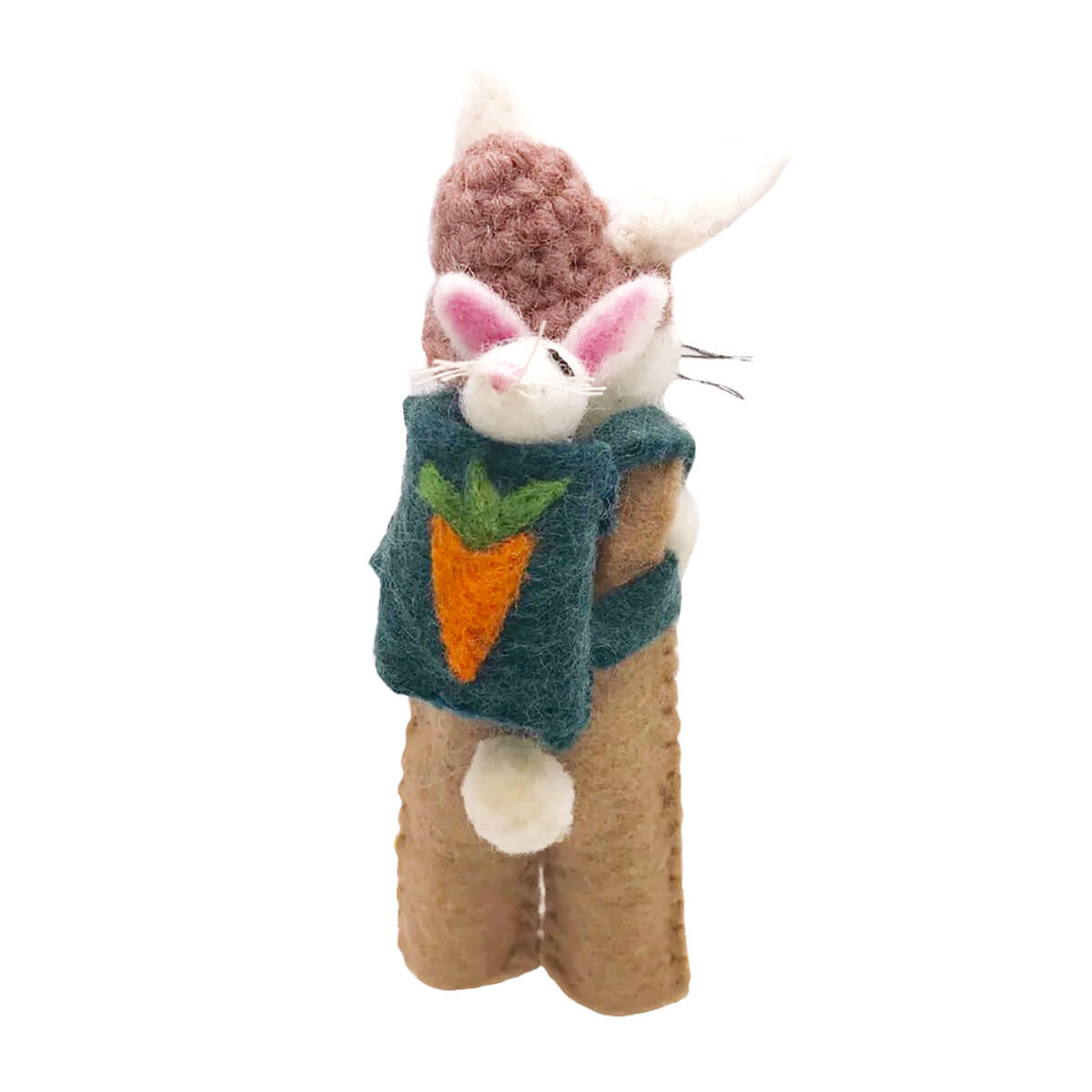 Bunny with baby bunny in a backpack hanging decoration by Amica. A lovely Bunny parent in beige dungarees carrying the cutest baby bunny in a carrot backpack. This lovely hand-felted decoration is perfect for hanging on your Easter tree, as part of an Easter Egg hunt or for decorating the home in Spring.