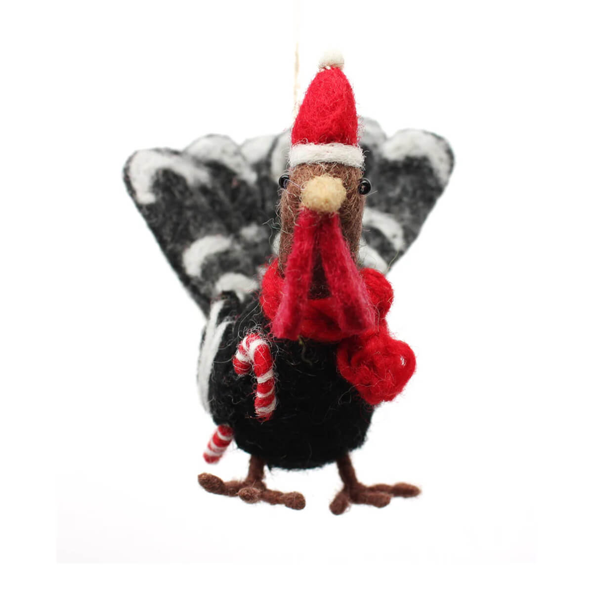 Festive Turkey With Candy Cane Hanging Christmas Decoration by Amica. A fabulous Festive Turkey with a Candy Cane tucked under a wing for an extra Christmassy feel. Comes with a hanging loop ready to go on the Christmas tree. A beautiful, handmade and fair trade felt decoration.