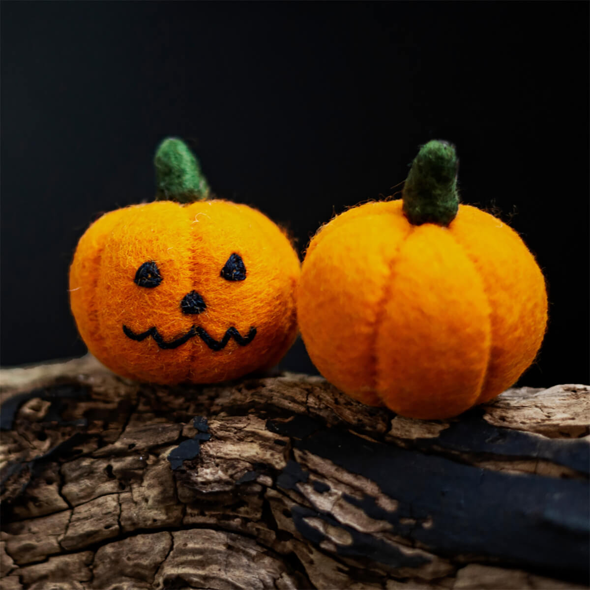 Halloween pumpkin with face hanging Halloween decoration by Amica. No need to prove your pumpkin carving skills here! Comes with a hanging loop to hang anywhere you need a little extra spookiness this Halloween. A beautiful, handmade and fair trade felt decoration.