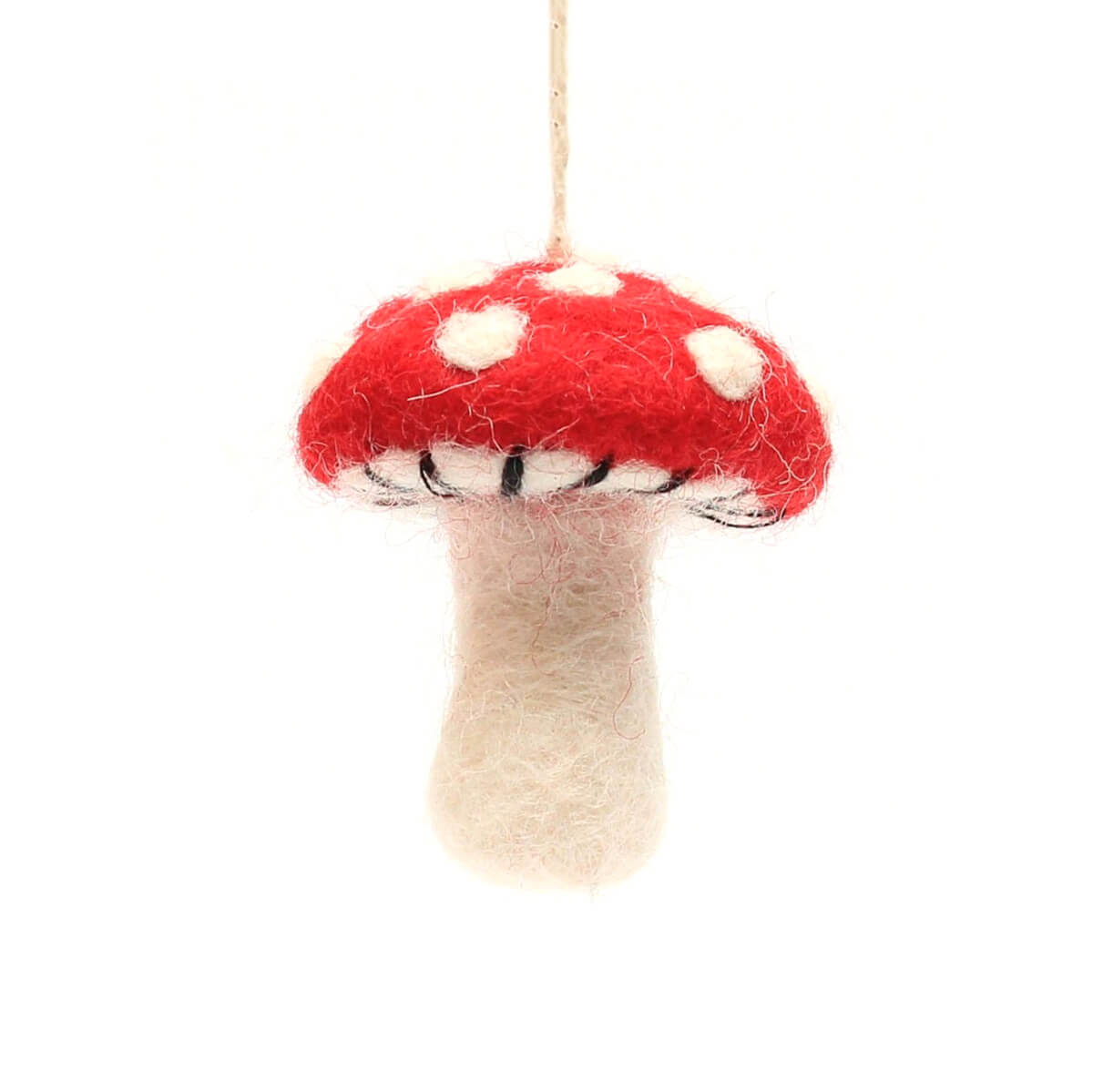 Mini Toadstool hanging decoration by Amica. A fabulous little Toadstool for decorating over Halloween, Autumn and also Christmas. A beautiful, handmade and fair trade felt decoration.
