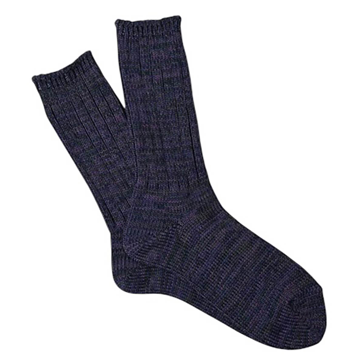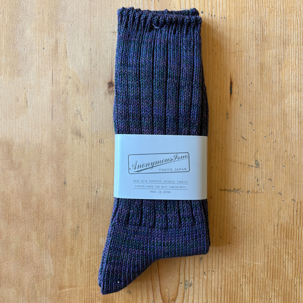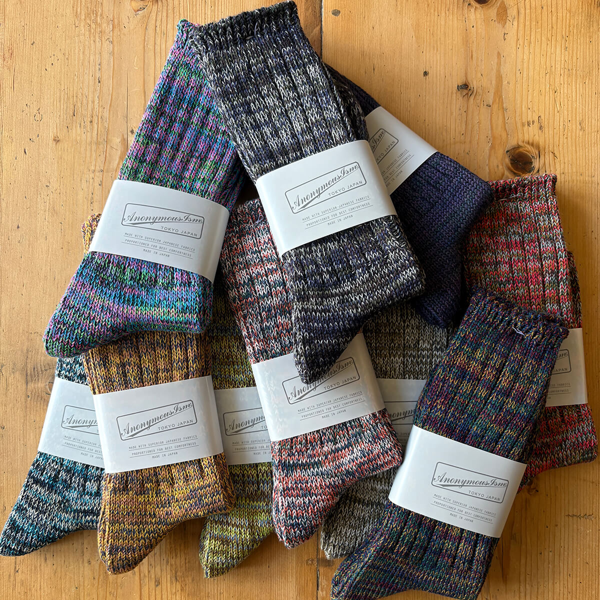 5 Colour Mix Crew Adult Socks by Anonymous Ism. The 5 colour mix crew is a medium-weight, chunky knit sock with a bouncy feel to the yarn and a supremely comfortable ribbed top. This is a signature piece from Anonymous Ism, blending craftsmanship with quality. The knitted fabric is carefully crafted using a unique over-gauge technique on low-gauge machines, achieving a perfect balance of softness, thickness, and durability. Made with vibrant, high-quality combed yarn, the socks reveal a rich, colourful pattern as the five hues intertwine beautifully, creating a distinctive and dynamic look.